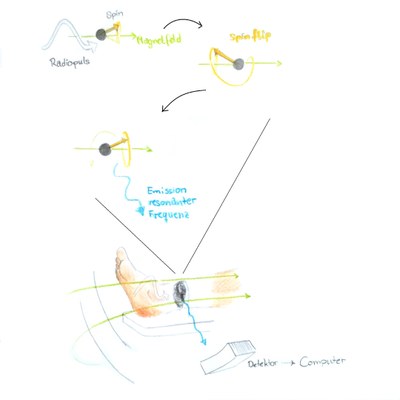 Bei einer Magnetresonanztomographie (MRT) legt man sich in ein Gerät mit einer großen Magnetspule, die mithilfe von Magnetfeldern und Radiopulsen gefahrlos Schnittbilder des Körpers aufnimmt. Der Körper enthält viele Wasserstoffatome, deren Kerne einen Spin haben. Dieser richtet sich entlang der Magnetfeldlinien im Inneren des Geräts aus. Ein Spin kann nur in oder gegen die Richtung des Feldes orientiert sein. Der Energieunterschied der Zustände ist abhängig von der Magnetfeldstärke und wird durch einen Radiopuls überwunden. Beim Rückfall in den erstgenannten, energetisch günstigeren Zustand wird ein Radiopuls mit exakt der Energiedifferenz dieser Zustände ausgesandt und detektiert. Je mehr Wasserstoffatome in einem Bereich vorhanden sind, desto „heller“ das Signal. Das laute Klopfen oder Brummen beim MRT kommt von den starken Stromänderungen, welche die Spulen vibrieren lassen.