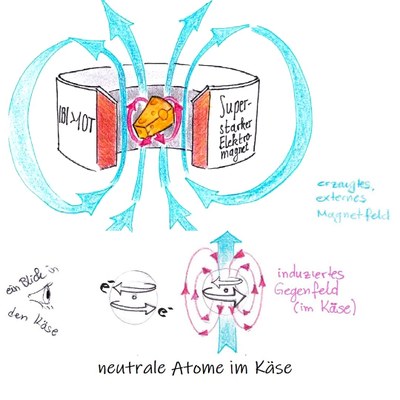 Die meisten Materialien, wie z. B. Käse oder Wein lassen sich nicht durch einen handelsüblichen Magneten beeinflussen. Tatsächlich werden sie aber von extrem starken Magnetfeldern abgestoßen (hunderte Male stärker als ein Kühlschrankmagnet)! Dieses Phänomen nennt man Diamagnetismus. So kann Käse gegen die Schwerkraft in der Luft gehalten werden. Diamagnetismus tritt auf, weil selbst in Atomen und Molekülen ohne die makroskopische Eigenschaft des magnetischen Moments, die einzelnen Elektronen in Umlauf um ihre Atomkerne von dem starken Magnetfeld erfasst werden. Dank der Lenz’schen Regel wirkt nun eine Kraft, die gegen das Magnetfeld gerichtet ist.