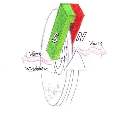 Ein Magnet erzeugt in einem bewegten Metallstück elektrische Ströme, die im Kreis fließen, sogenannte Wirbelströme. Durch den endlichen elektrischen Widerstand des Metalls wird dabei Wärme frei. Außerdem bremst dieser Vorgang das Metallstück, ohne die Oberfläche zu verschleißen. Im Gegensatz zu anderen Bremssystemen sind Wirbelstrombremsen also verschleißfrei und kommen deshalb in Zügen, Achterbahnen und Fitnessgeräten zum Einsatz.