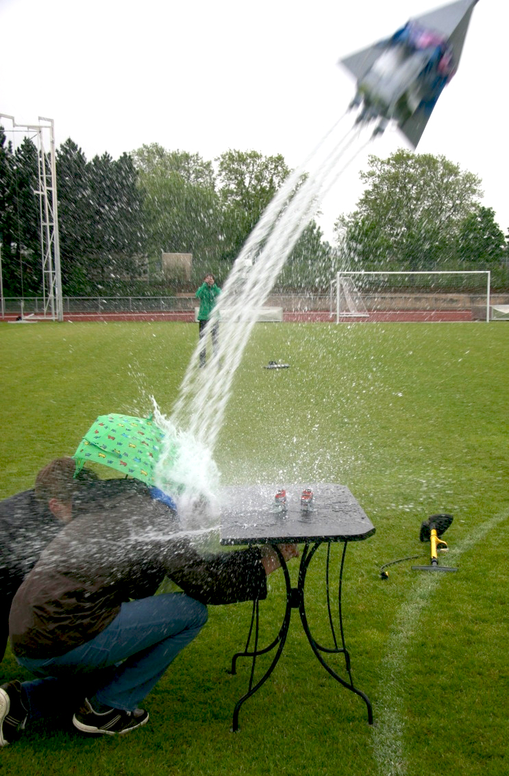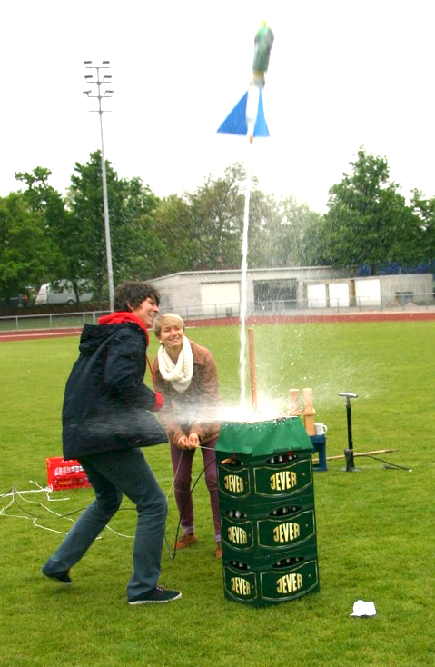 Am Freitag, den 17.05.13 war es mal wieder so weit – monatelange Vorbereitung sollte sich an diesem Tag auszahlen. Ich spreche hier vom alle drei Jahre stattfindenden Messen vieler Jungkonstrukteure im, wie es Herr May so treffend betitelte, „modernen Raketen-Wassersport“. Immer wieder versuchen Schüler mit Hilfe einfachster Mittel, wie PET-Flaschen, Ventilen und dem richtigen Wasser-Luft Verhältnis ihre Raketen in die Höhe zu befördern.