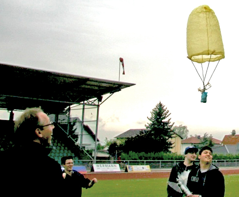 Siegerteam.jpg Dieses Jahr fand der Wettbewerb der Fachschaft Physik unter dem Motto „Projekt (Sk)Eifall“ statt. Ziel war es, die Rakete nicht nur so hoch wie möglich in die Luft zu schießen, sondern auch ein in oder an der Rakete befestigtes Ei mittels eines Fallschirms sicher auf dem Boden landen zu lassen. Die Schwierigkeit hierbei bestand darin, dass das Ei möglichst in einem Stück ankommen und trotzdem eine möglichst lange Flugzeit erreichen sollte.