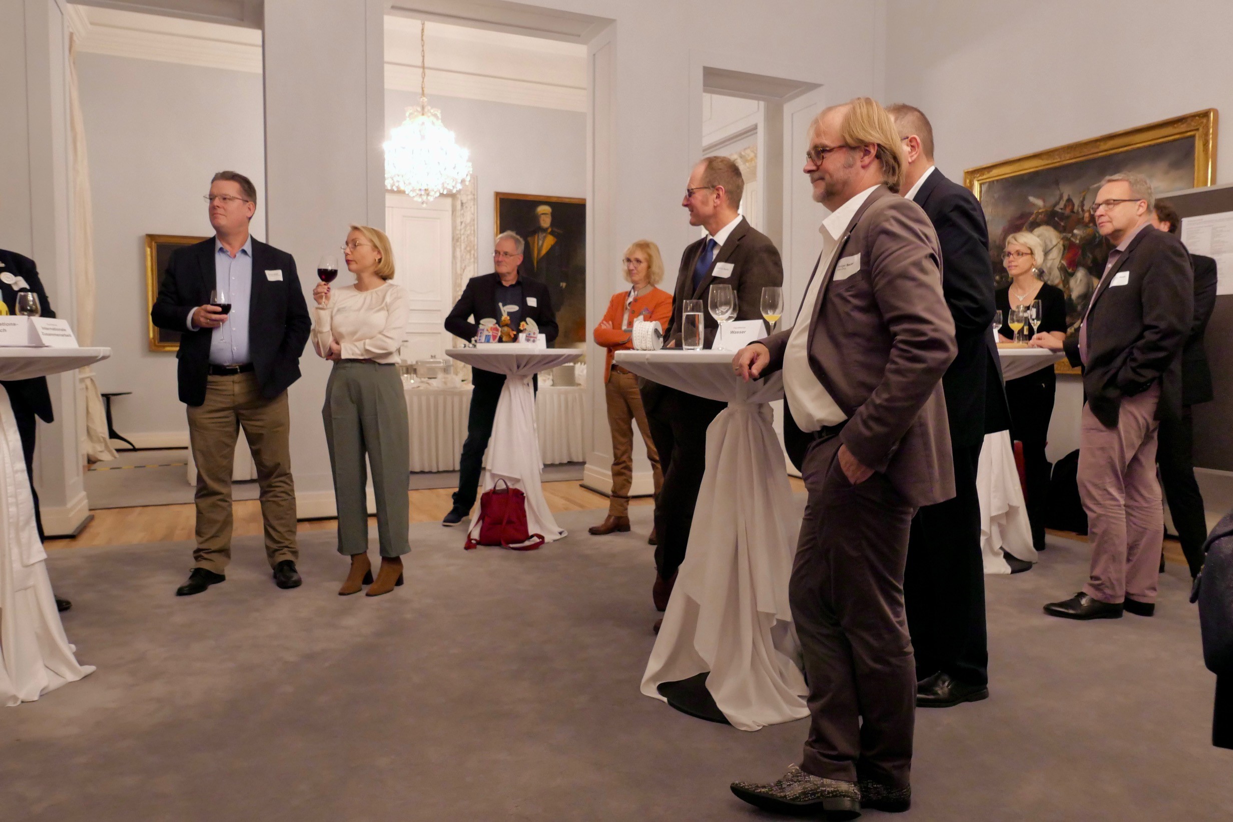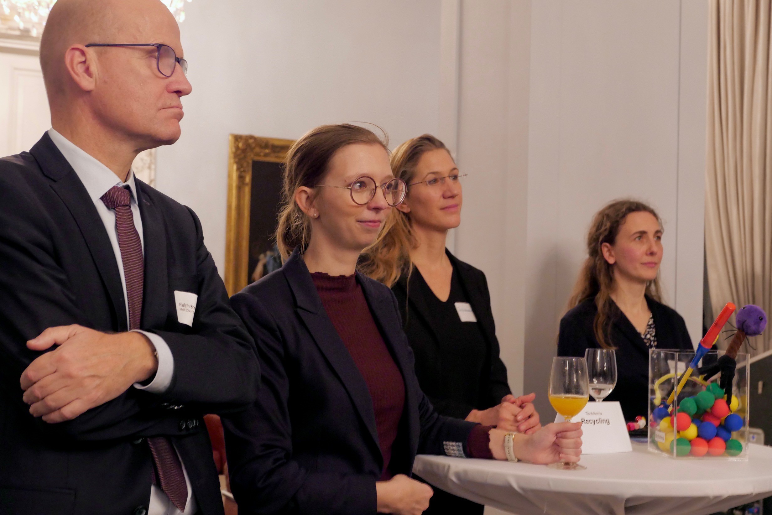 Die anwesenden Expertinnen und Experten machten den Bundestagsabgeordneten und ihren Mitarbeiter:innen in zahlreichen Gesprächen an „Thementischen“ deutlich, wie Forschung und Innovation einen bedeutenden Beitrag zu einer nachhaltigen Entwicklung leisten können. Themen aus der Physik waren beispielsweise Wertstoffkreisläufe, Ressourcenmanagement und biohybride Recyclingverfahren für Seltene Erden. Rolf-Dieter Heuer, der auch durch den Abend führte, berichtete u. a. über SESAME, ein Beispiel nachhaltiger internationaler wissenschaftlicher Zusammenarbeit im Nahen Osten. Schirmherr der Veranstaltung war Stephan Albani, MdB.