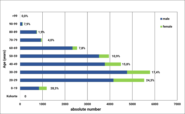 In the chart, the age structure of DPG is shown. Because of the relatively low number of DPG members below 10 years service, the cohorts between 0-9 and 10-19 years are summed up. The share of male members is depicted in blue, whereas the female share is in green. Most DPG members are younger than 40 years old. In this segment, the share of female physicists is much higher than the total average.