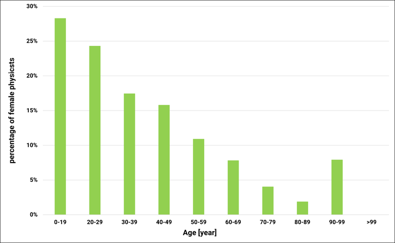 The diagram shows the percentage of female physicists within DPG per cohort. Because of the relatively low number of DPG members below 10 years service, the cohorts 0-9 and 10-19 years are summed up. As expected, the percentage of female members decreases with increasing age. The female share within the group of members being less than 20 years old constitutes more than 25 percent, which exceeds the female share of physics first-year students.