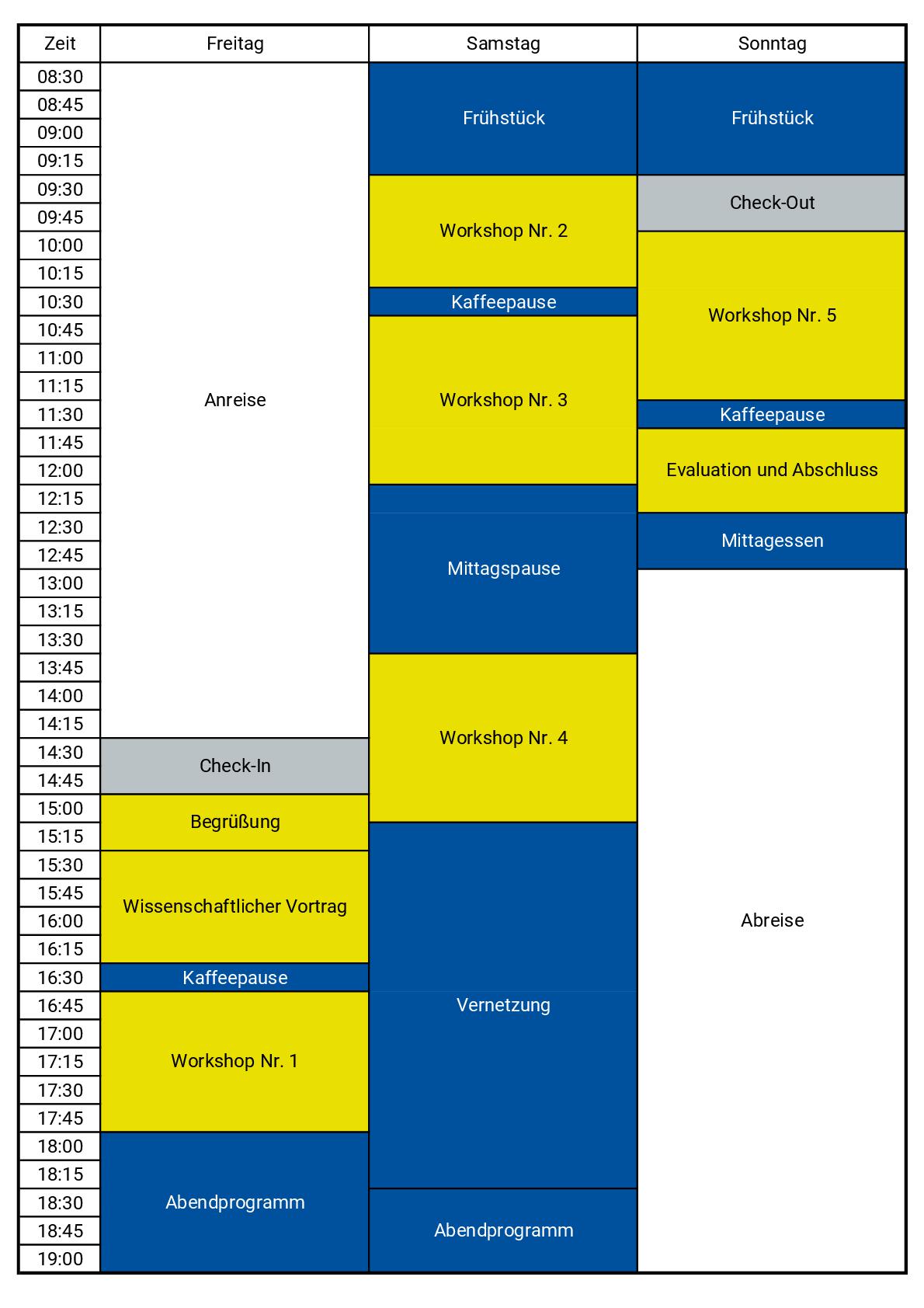 Neben interessanten Workshops gibt es ein abwechslungsreiches Rahmenprogramm und reichlich Zeit zur Vernetzung und zum persönlichen Austausch. Den Zeitplan kannst du der folgenden Tabelle entnehmen.