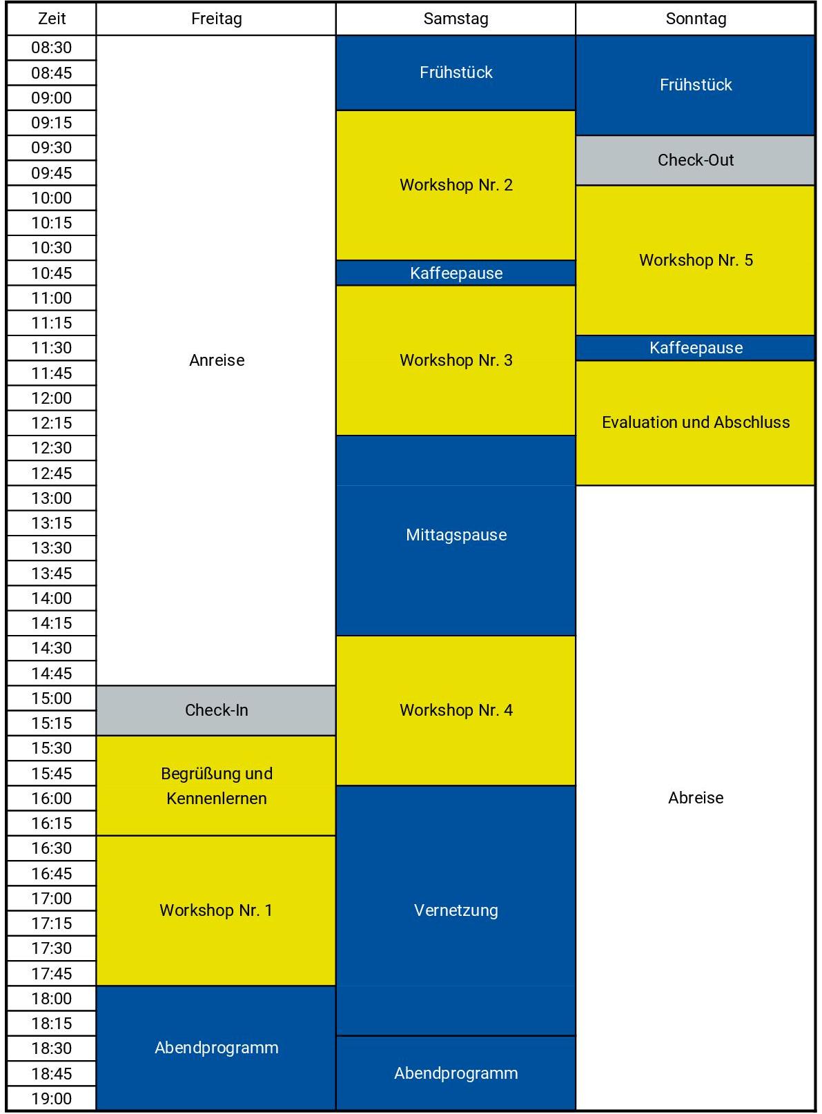 Neben interessanten Workshops gibt es ein abwechslungsreiches Rahmenprogramm und reichlich Zeit zur Vernetzung und zum persönlichen Austausch. Den Zeitplan kannst du der folgenden Tabelle entnehmen.