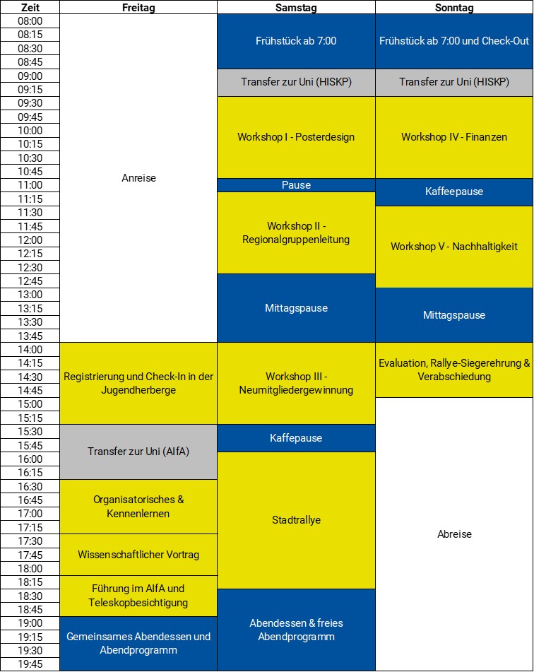 Das Programm umschließt interessante Workshops, die sich mit Themen rund um die jDPG beschäftigen und du aktiv mit anderen daran arbeiten und diskutieren kannst. Außerdem wird es eine Exkursion zum Argelander-Institut für Astronomie geben! Daneben gibt es ein abwechslungsreiches Rahmenprogramm, reichlich Zeit zur Vernetzung und zum persönlichen Austausch.