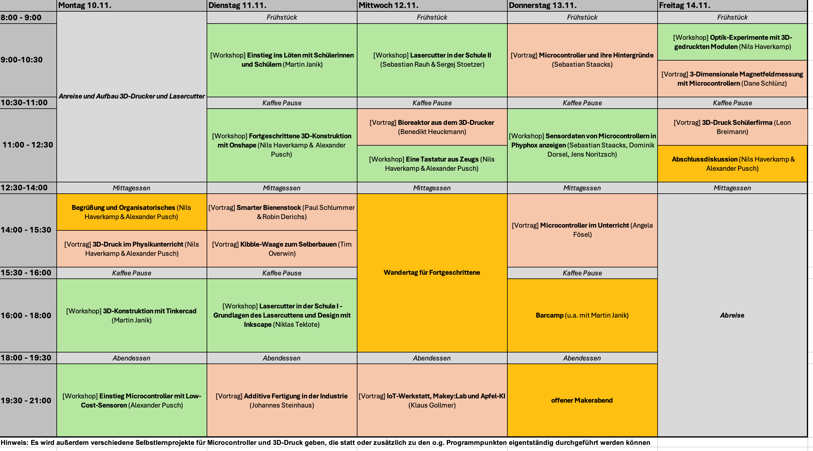 Der zweite Teil der Fortbildung (Mittwoch bis Freitag) beinhaltet verschiedene, auf den Grundlagen aufbauende, komplexere Workshops und Vorträge mit vielen weiteren schultauglichen Projekten für den Physikunterricht. Die Fortbildung kann komplett oder auch in Teilen besucht werden.