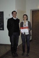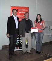 The third award goes to Mrs. Olivia Stiehl (diploma student in the research group of Prof. Matthias Weiss at Universität Bayreuth) for her contribution "Kinetics of DNA hairpin-loops in crowded and non-crowded fluids". Using a combination of fluorescence correlation spectroscopy and fluorescence energy transfer, Olivia Stiehl investigated the kinetics of thermally induced DNA hairpin-loop fluctuations. Thereby, she paid particular attention to the influence of macromolecular crowding on the time constant of opening/closing of the DNA loops as well as on the fraction of open DNA loops. It is expected that an improved understanding of the kinetics of hairpin loops may help to improve, for instance, the efficiency of antisense drugs. Olivia Stiehl's most appealing poster as well as her clear presentation explained the approach and results in an excellent manner.