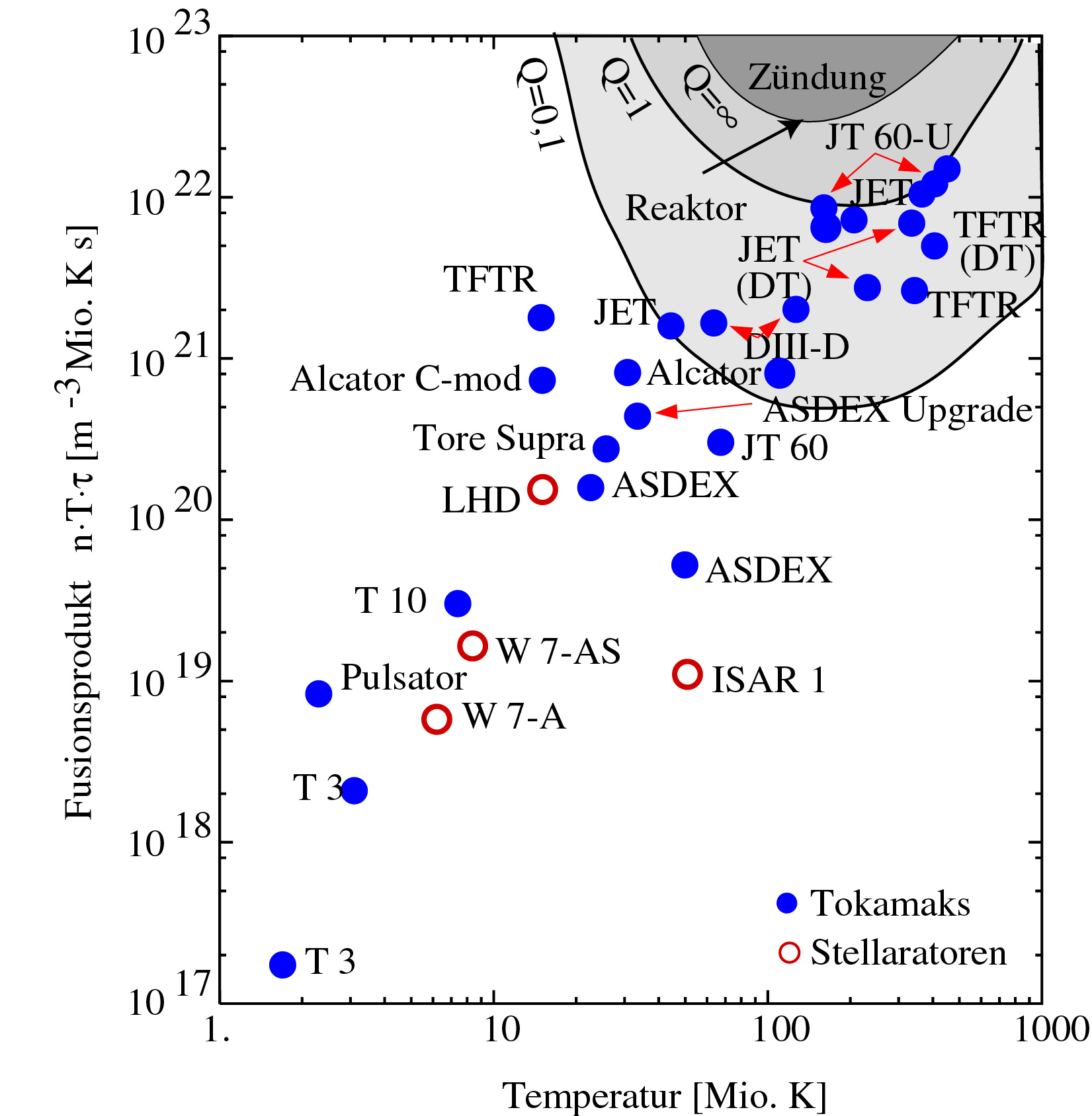 Abb. 4 zeigt die Werte des Fusionsproduktes n× T× t E, die in verschiedenen Experimenten (Tokamaks und Stellaratoren) bislang erreicht wurden. In Tab. 1 sind einige Eigenschaften der Experimente zusammengestellt: das Jahr des Experimentbeginns, der Radius R des Plasmarings, der Radius a des Plasmas, das Magnetfeld B im Plasmazentrum und die gesamte Zusatzheizung. Der höchste Wert des Fusionsproduktes, 1997 erzielt an JET (Joint European Torus, Culham, einem Projekt der europäischen Gemeinschaft) ist noch etwa einen Faktor 7 von Zündung entfernt. Der niedrigste Wert auf der Abbildung ist von dem ersten Tokamak, T3, von 1968. Damit wurde in drei Jahrzehnten das Fusionsprodukt um einen Faktor von etwa 10.000 verbessert. Die getönten Flächen markieren den Q-Faktor, dem die Plasmabedingungen für ein Deuterium/ Tritium Gemisch entsprechen. Nur zwei Experimente erlaubten Betrieb mit Deuterium und Tritium: JET und TFTR (Tokamak Fusion Test Reactor, Princeton, USA). Bislang wurden Rekordwerte von mehr als 16 MW bzw. 10 MW Fusionsleistung in diesen Experimenten erreicht.