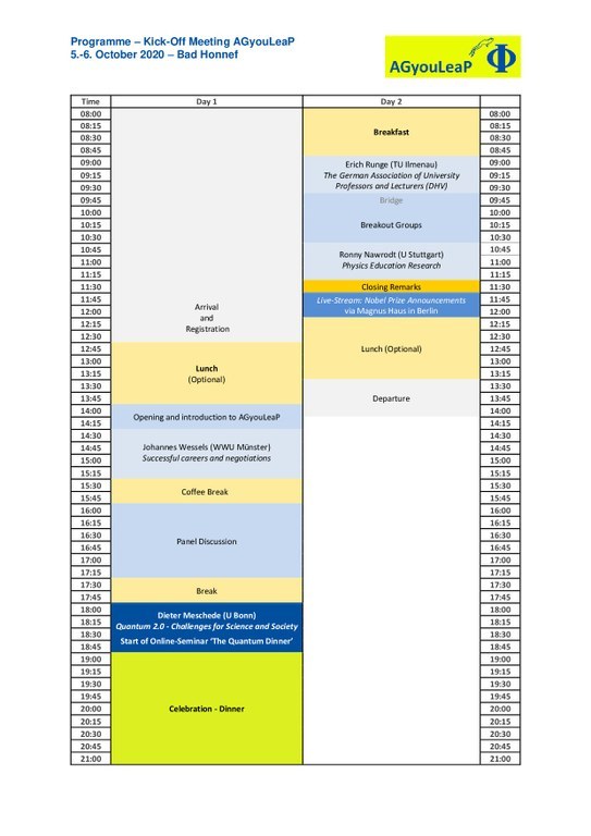 Im Vordergrund des Kick-Off Meetings steht die Präsentation und künftige Gestaltung des Arbeitsgruppen Konzeptes, welche um Diskussionen zu Herausforderungen und Möglichkeiten der Statusgruppe der „Nachwuchsgruppenleiter*innen“ ergänzt wird. Die Gestaltung und Ausrichtung der AGyouLeaP soll im Rahmen der Podiumsdiskussion sowie den Break-Out Sessions besprochen werden. Zum Kennenlernen und Diskutieren planen wir längere Pausen. Den Abend beginnen wir mit einem wissenschaftlichen Festvortrag zum Themenkomplex Quantentechnologien, der zugleich den Auftakt für unsere Online-Seminar-Reihe „Quantum Dinner“ bildet. Anschließend lassen wir den Abend bei einer gemeinsamen Feier ausklingen. Das Programm zu Download gibt es hier.