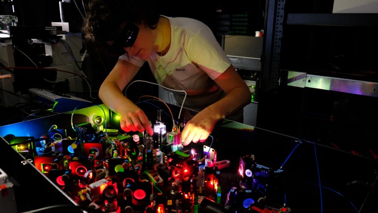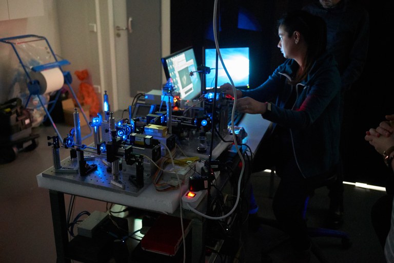 Jasmin is a postdoctoral researcher in the Department of NanoBiophotonics at the Max Planck Institute for Biophysical Chemistry. Under supervision of Nobel Laureate Stefan Hell she is working on the advancement of optical superresolution microscopy approaches to study biological mechanisms at the nanoscale. Together with her colleagues, Jasmin developed the MINFLUX nanoscopy approach for mapping proteins of different organelles with nanometer precision in all three dimensions and multiple color channels. To achieve such high precisions with conventional fluorophores, the researchers target the minimum of a doughnut-shaped excitation beam to positions very close to an emitting molecule. They can exploit the knowledge of beam position and beam shape, so that only few fluorescence photons are required to estimate the molecule position with nanometer-scale precision. The picture shows her at the microscope, aligning the beam path to achieve a perfect excitation beam shape.
