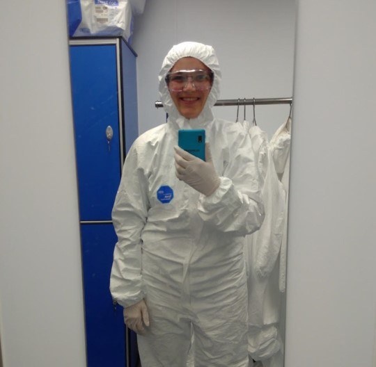 Juliane is a Postdoctoral Researcher on a joint project with the University of Cambridge and AMOLF research institute in Amsterdam. She fabricates and studies thin-films of metal halide perovskites using co-evaporation in vacuum. These perovskites are promising materials for the development of a new generation of efficient, cheap and flexible solar cells which are one puzzle piece for a solution to the climate change crisis. She makes thin-films of these materials which she uses to study their fundamental properties and to build test solar cells. She is particularly interested in how the perovskites interact with light to generate electricity. These materials and the insights she gains about them can also be used in other optoelectronic devices for example light emitting devices (LEDs) and photodetectors. The photo shows her in full cleanroom gear.