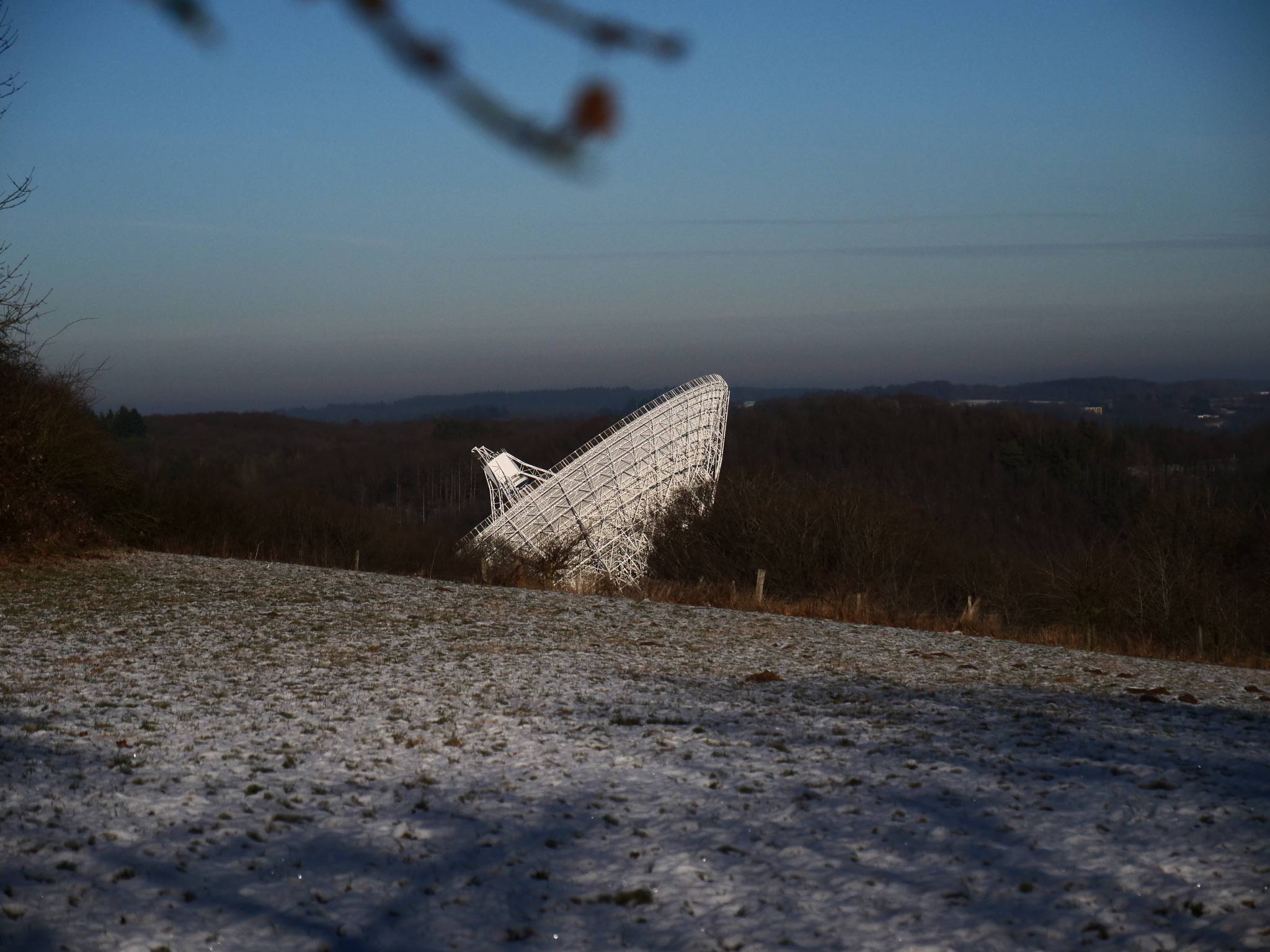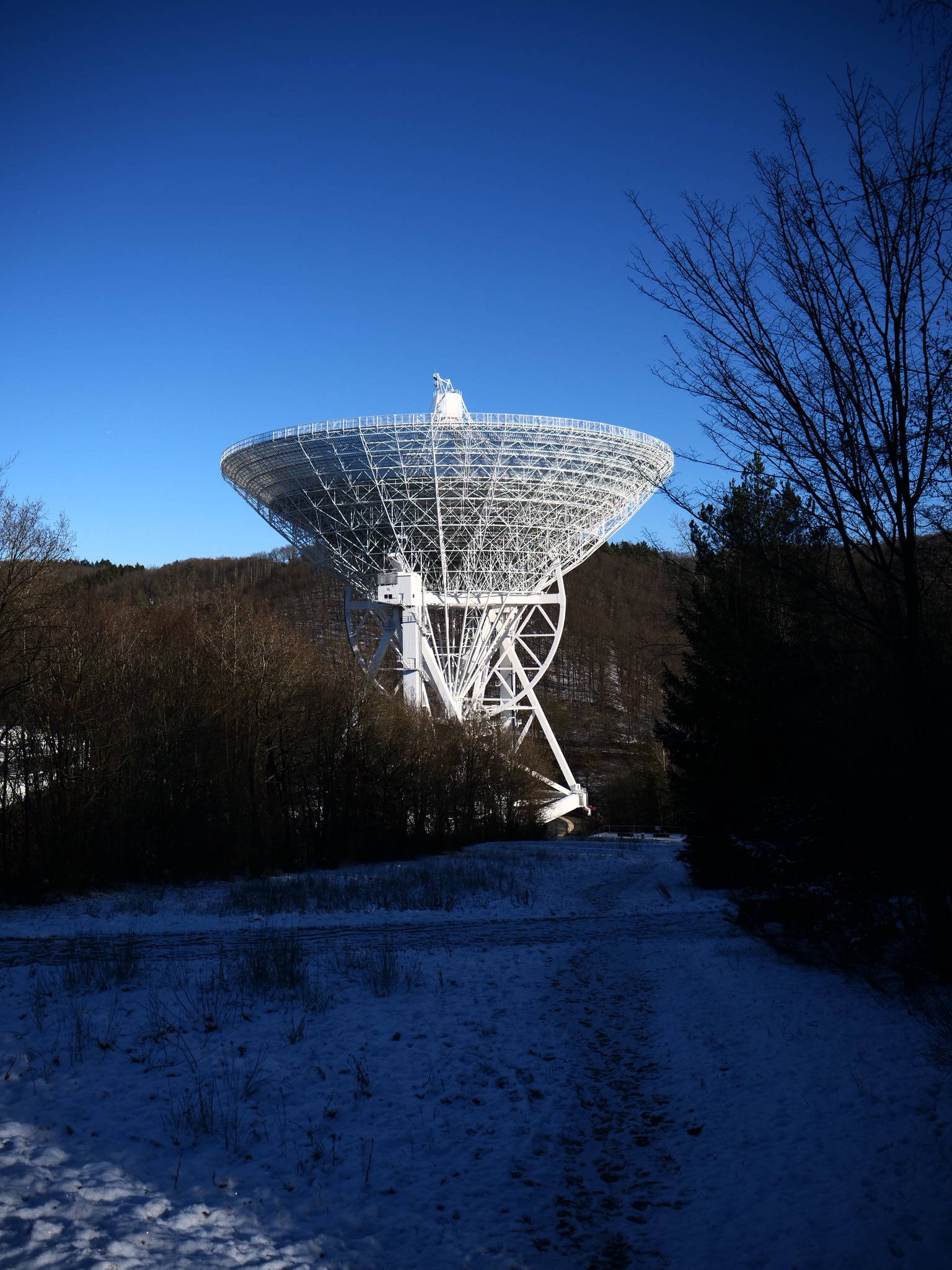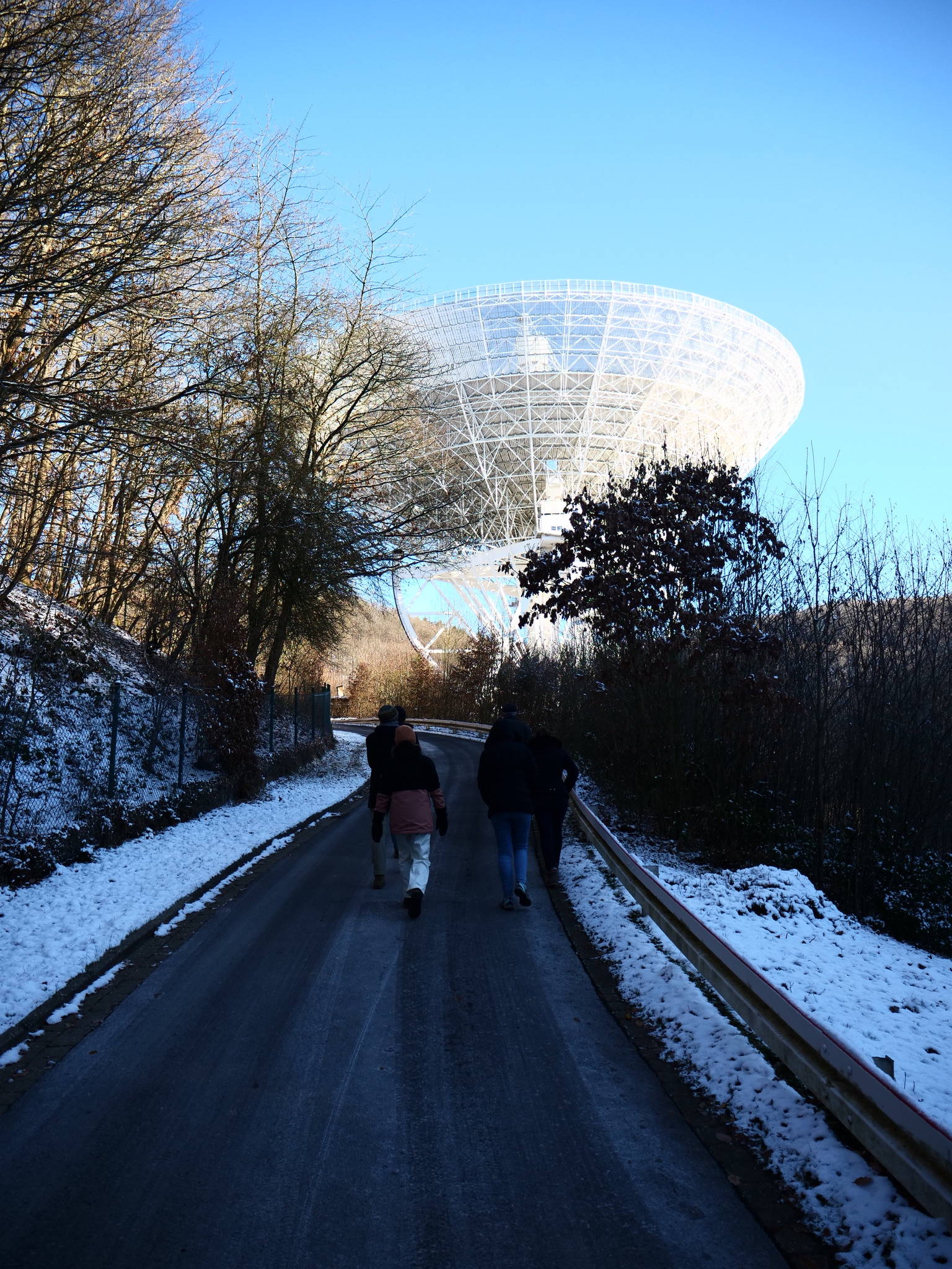 Schon von weitem sahen wir die für den Laien auf den ersten Blick vielleicht etwas zu groß wirkende Satellitenschüssel mitten in der Natur. Doch in Wirklichkeit stand da am Rande eines kleinen Dorfes das weltweit zweitgrößte Radioteleskop seiner Art mit einem Durchmesser von 100 m vor uns. Andächtig schritten wir bei Minusgraden durch den stillen Morgen darauf zu. Die Szenerie aus einer dünnen Schicht Schnee, einem strahlend blauen Himmel und dem weißen Parabolspiegel war für uns Astronomiebegeisterte einfach magisch.
