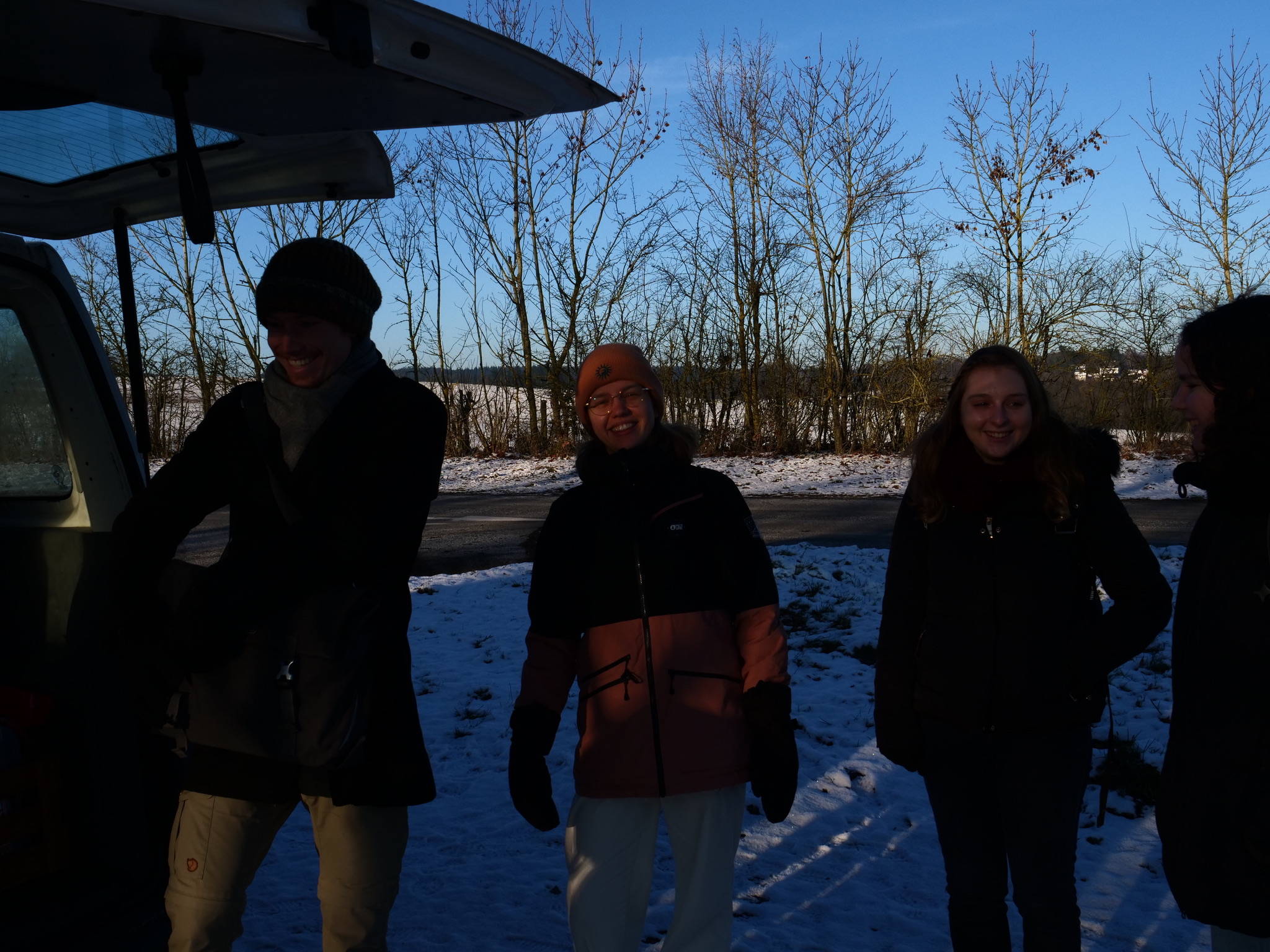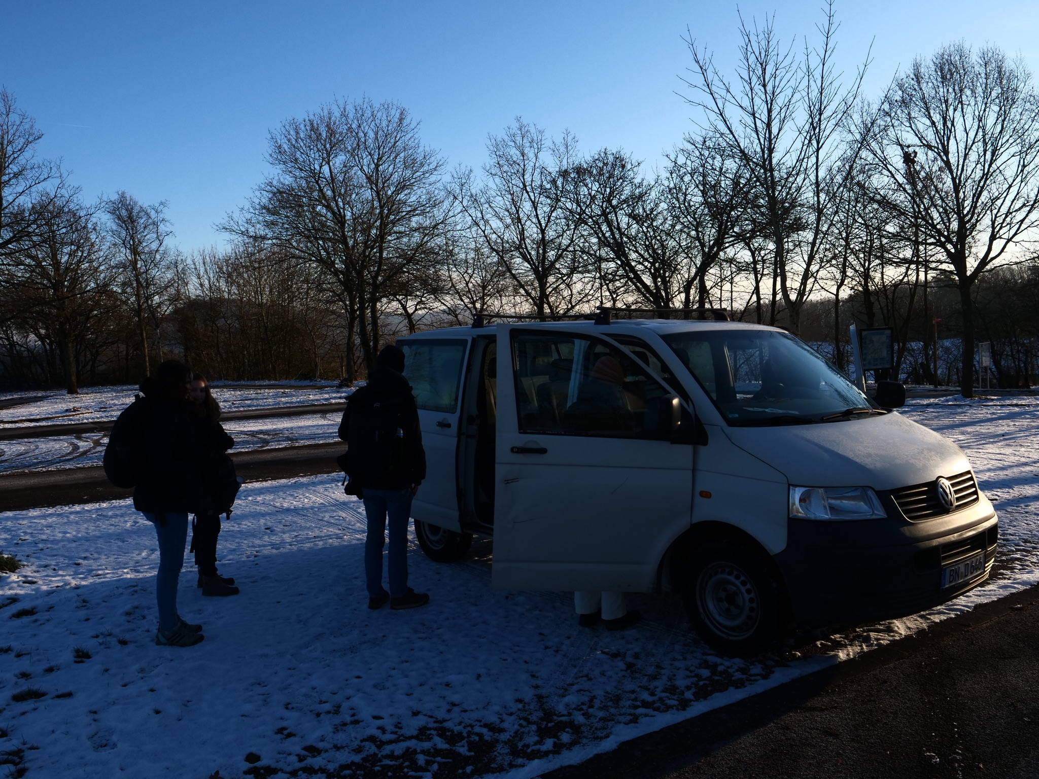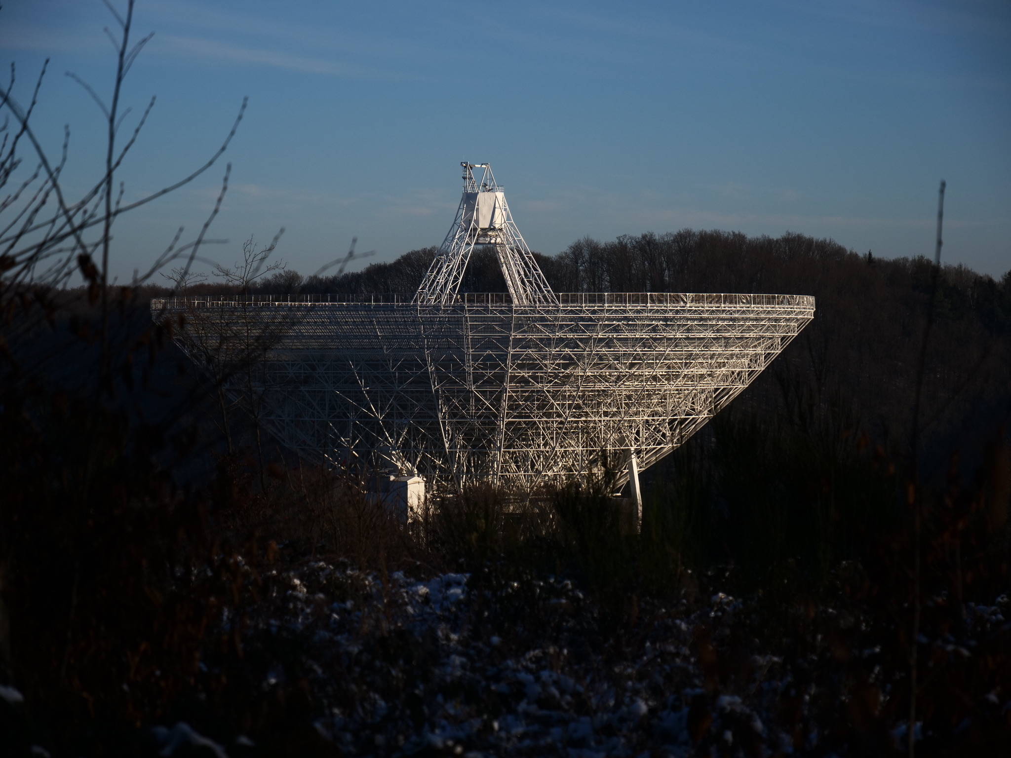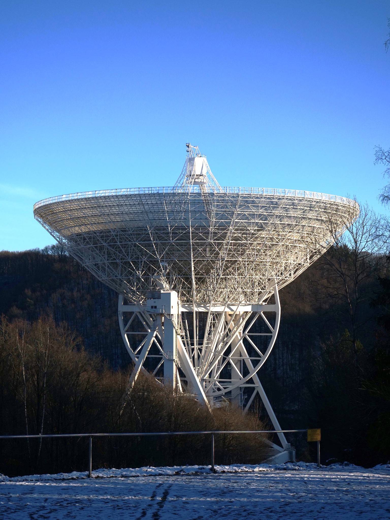 Schon von weitem sahen wir die für den Laien auf den ersten Blick vielleicht etwas zu groß wirkende Satellitenschüssel mitten in der Natur. Doch in Wirklichkeit stand da am Rande eines kleinen Dorfes das weltweit zweitgrößte Radioteleskop seiner Art mit einem Durchmesser von 100 m vor uns. Andächtig schritten wir bei Minusgraden durch den stillen Morgen darauf zu. Die Szenerie aus einer dünnen Schicht Schnee, einem strahlend blauen Himmel und dem weißen Parabolspiegel war für uns Astronomiebegeisterte einfach magisch.