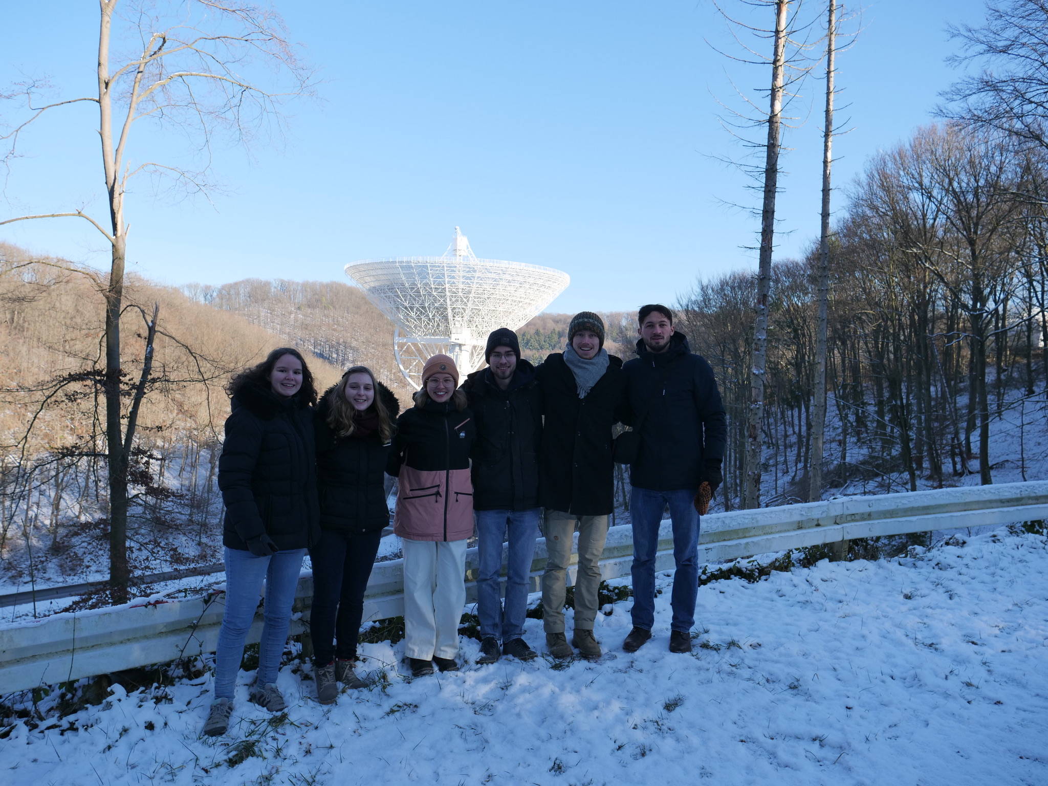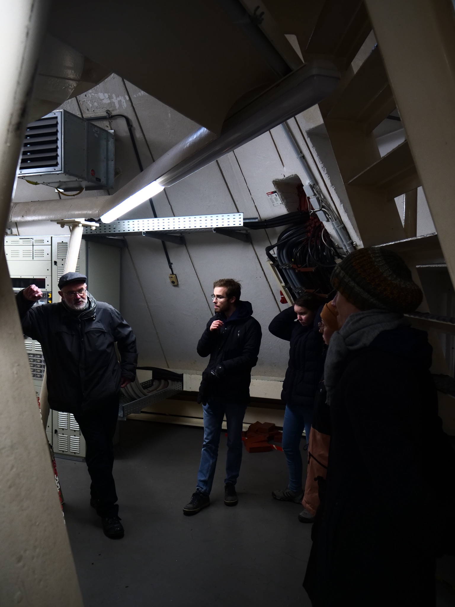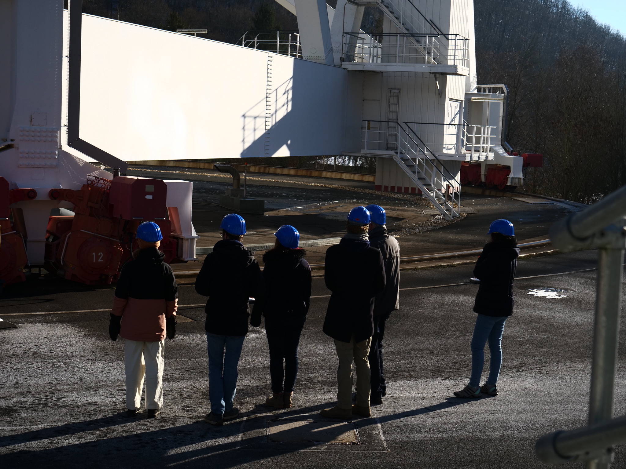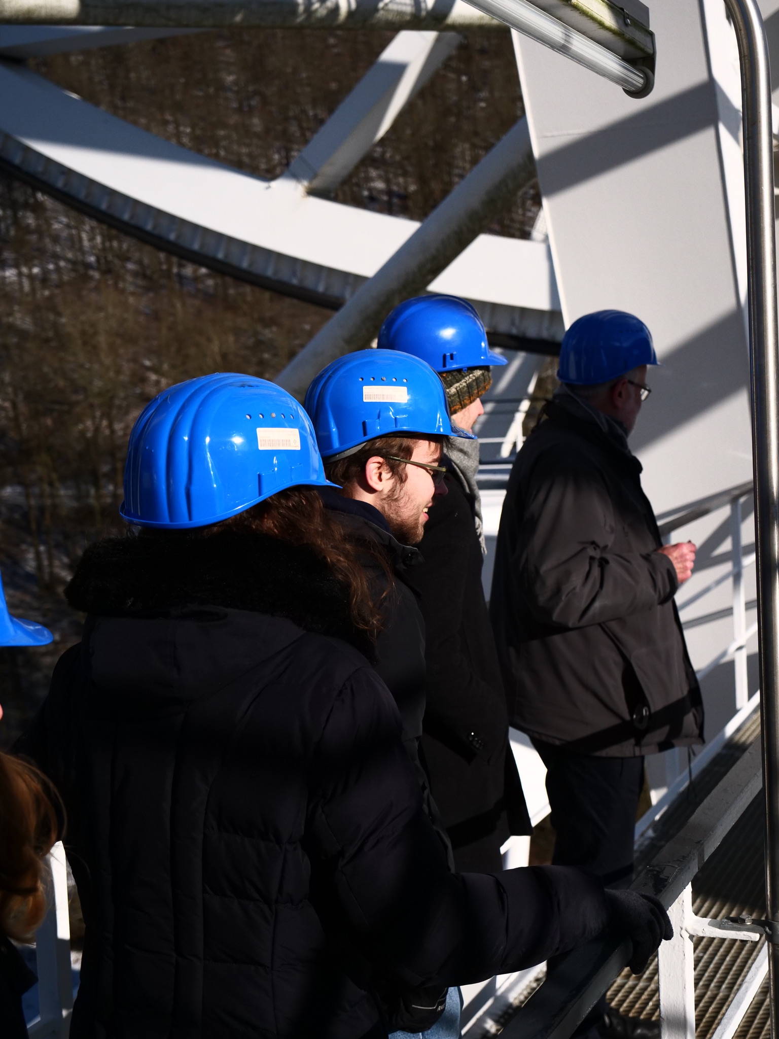 Die eigentliche Führung, bei der wir vor allem unsere technischen Fragen zum Radioteleskop beantwortetet wurden, startete dann direkt am Fuße des Teleskops mit den Antennen des LOFAR-Interferometers. Ein einfacher Aufbau aus 4 Drähten, einem rostigen Gitter und ein bisschen Elektronik schafft es durch die in ganz Europa verteilten Antennen mittels Interferometrie eine hohe Auflösung zu erreichen. Vorbei am alten Sekundärspiegel- ungefähr die Größe des James Webb Teleskops- ging es hoch zum Institut. Dort schauten wir beim Operateur vorbei, um uns für die Begehung des Teleskops anzumelden. Neben der Steuerung des Teleskops ist er auch für die Sicherheit am Teleskop zuständig. Ausgestattet mit Helmen -“schützen vor der berühmten fallenden Schraube”- fuhren wir im Aufzug auf 50 m Höhe zur Kippachse des Teleskops. Draußen war es sehr laut, da die Kühlungsgeneratoren für die Beobachtungsinstrumente liefen. Näher kommt man dem Hauptspiegel, der nur wenige Meter über unseren Köpfen war, eigentlich nicht. Außerdem hatten wir einen wirklich schönen Ausblick auf das winterliche Tal. Zurück am Boden ging es in die Katakomben in den Königszapfenraum. Hier konnten wir das ganze Sammelsurium an Kabeln für die Elektronik und Datenverarbeitung begutachten, die zum Teleskop hin- und wegführen. Erstaunt waren wir von der Präzision von 0.2 mm mit der das 3200t (800 Elefanten) schwere Teleskop auf der horizontalen Schiene bewegt werden kann. Auch das Maler jeden Sommer das Teleskop zwei Monate lang streichen müssen, ließ uns leicht schmunzeln. Am faszinierendsten fanden wir aber die Tatsache, dass das Teleskop durch seine spezielle Bauweise die Spiegelform in jeder Lage einem Rotationsparaboloid anpasst. Ansonsten würde die jeweilig unterschiedliche Verformung des Spiegels eine Beobachtung unmöglich machen.