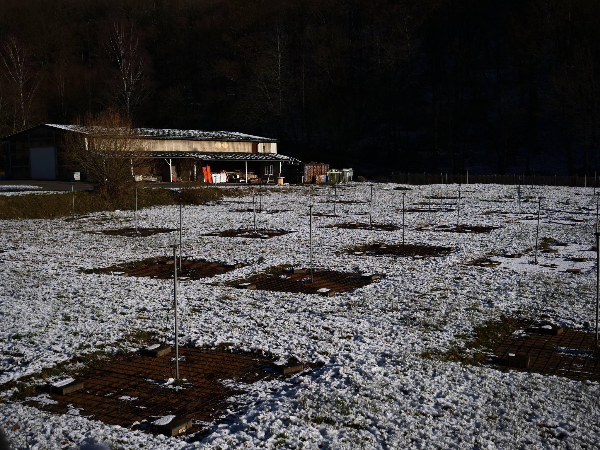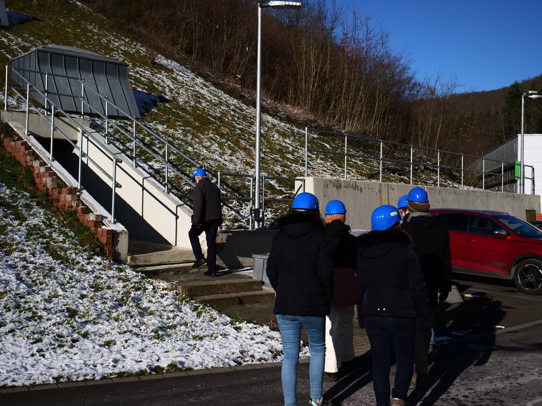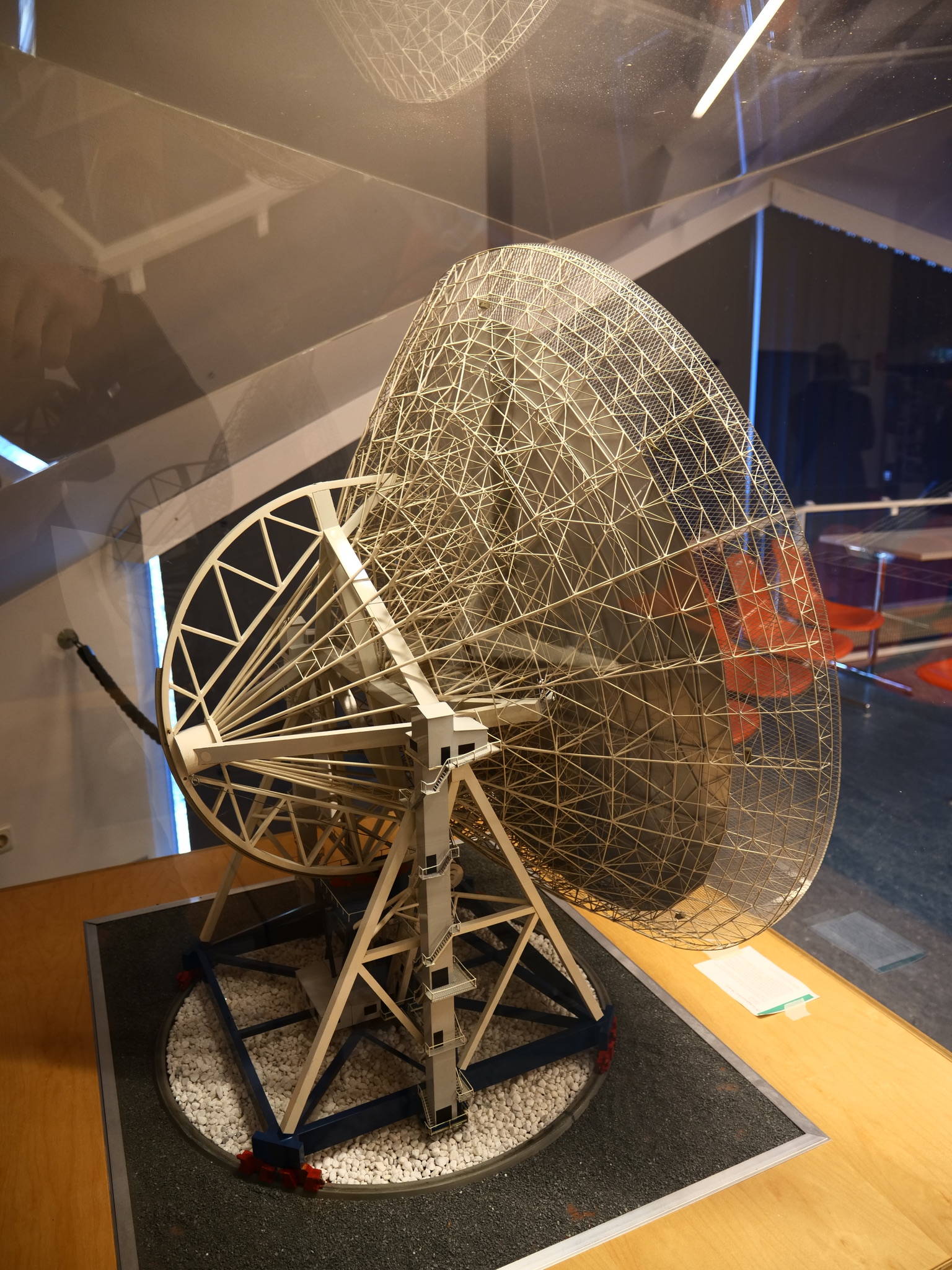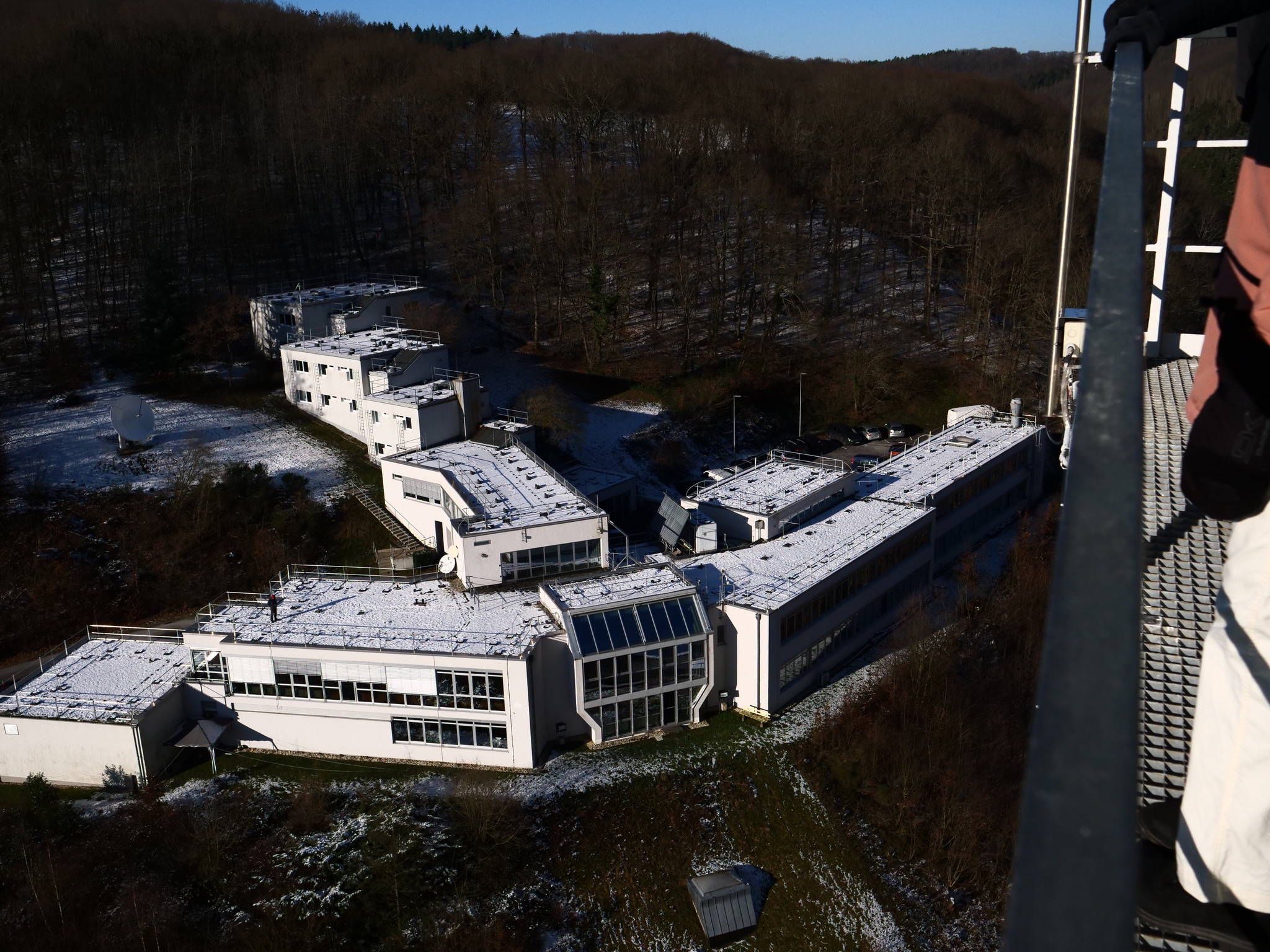 Die eigentliche Führung, bei der wir vor allem unsere technischen Fragen zum Radioteleskop beantwortetet wurden, startete dann direkt am Fuße des Teleskops mit den Antennen des LOFAR-Interferometers. Ein einfacher Aufbau aus 4 Drähten, einem rostigen Gitter und ein bisschen Elektronik schafft es durch die in ganz Europa verteilten Antennen mittels Interferometrie eine hohe Auflösung zu erreichen. Vorbei am alten Sekundärspiegel- ungefähr die Größe des James Webb Teleskops- ging es hoch zum Institut. Dort schauten wir beim Operateur vorbei, um uns für die Begehung des Teleskops anzumelden. Neben der Steuerung des Teleskops ist er auch für die Sicherheit am Teleskop zuständig. Ausgestattet mit Helmen -“schützen vor der berühmten fallenden Schraube”- fuhren wir im Aufzug auf 50 m Höhe zur Kippachse des Teleskops. Draußen war es sehr laut, da die Kühlungsgeneratoren für die Beobachtungsinstrumente liefen. Näher kommt man dem Hauptspiegel, der nur wenige Meter über unseren Köpfen war, eigentlich nicht. Außerdem hatten wir einen wirklich schönen Ausblick auf das winterliche Tal. Zurück am Boden ging es in die Katakomben in den Königszapfenraum. Hier konnten wir das ganze Sammelsurium an Kabeln für die Elektronik und Datenverarbeitung begutachten, die zum Teleskop hin- und wegführen. Erstaunt waren wir von der Präzision von 0.2 mm mit der das 3200t (800 Elefanten) schwere Teleskop auf der horizontalen Schiene bewegt werden kann. Auch das Maler jeden Sommer das Teleskop zwei Monate lang streichen müssen, ließ uns leicht schmunzeln. Am faszinierendsten fanden wir aber die Tatsache, dass das Teleskop durch seine spezielle Bauweise die Spiegelform in jeder Lage einem Rotationsparaboloid anpasst. Ansonsten würde die jeweilig unterschiedliche Verformung des Spiegels eine Beobachtung unmöglich machen.