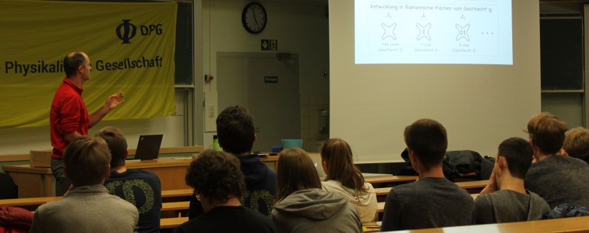 Anschließend konnten die Anwesenden einen Einblick in die aktuelle Forschung der Physik erhaschen. In einem Vortrag stellte Herr Jockers die grundlegenden Ideen der Stringtheorie vor. Dabei ging er darauf ein, warum diese Theorie aufgestellt wurde, was sie aussagt, aber auch welche Probleme es noch gibt. Obwohl die Stringtheorie bereits vieles erklären kann, fehlt es bisher an Experimenten, mit der sie überprüft werden kann.