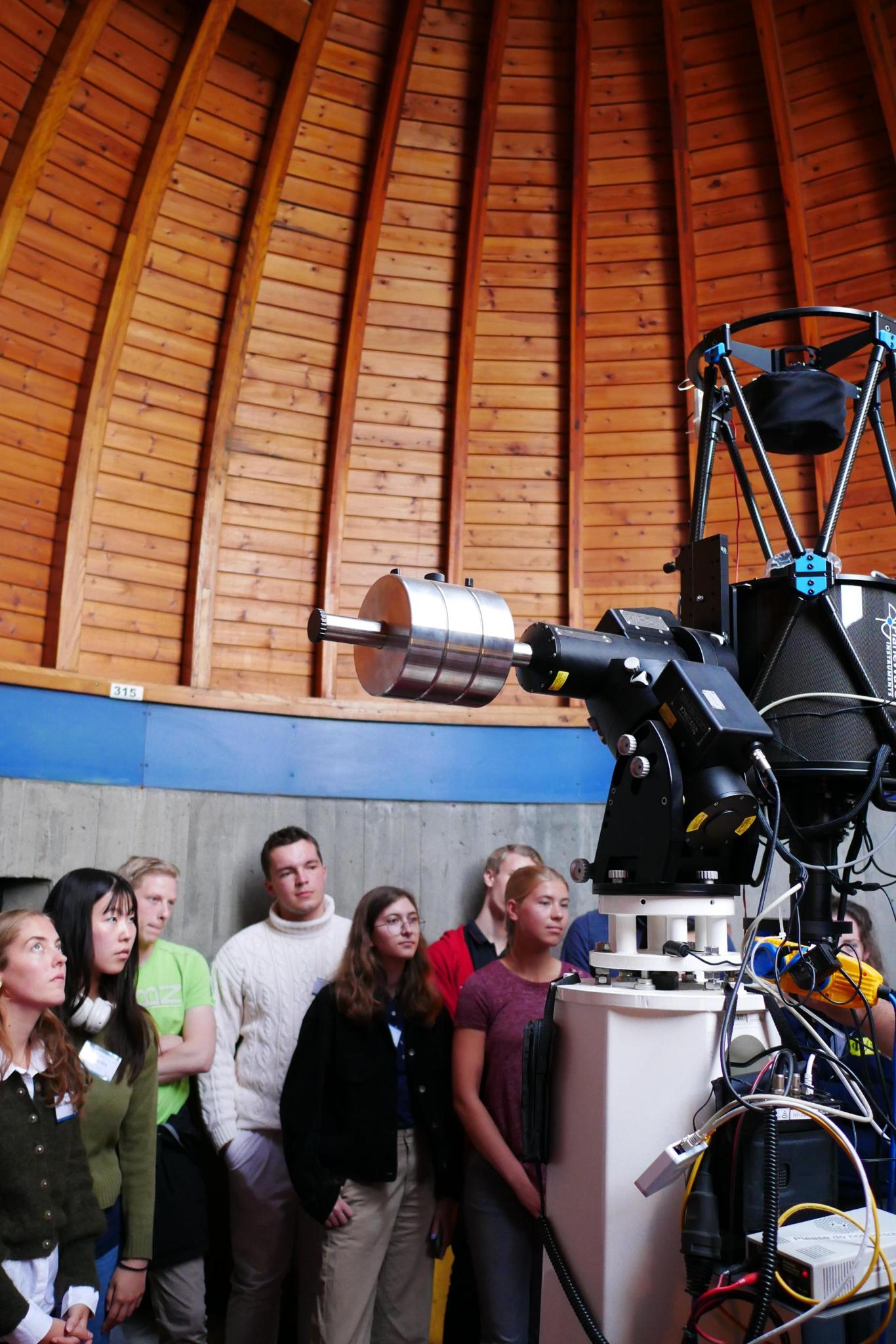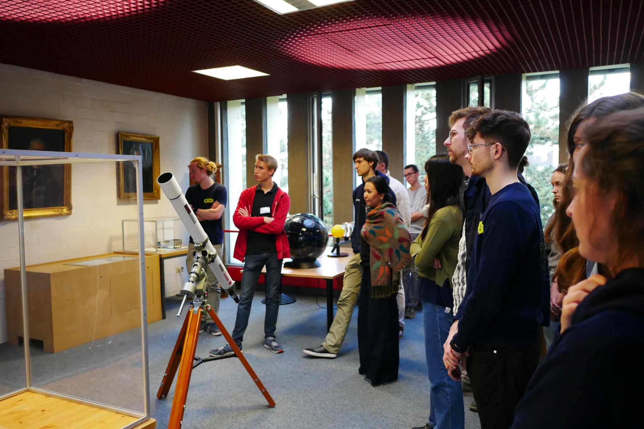 Nach einem ersten Kennenlernen am Freitag stand ein Besuch des Argelander Instituts für Astronomie (AIfA) mit einem spannenden Fachvortrag über die Detektion von Gravitationswellen mit Pulsar Timing Arrays auf dem Programm. Wir wurden durch die Ausstellung der Exponate der alten Sternwarte geführt und konnten einen Blick in die Kuppel mit dem modernen optischen Teleskop werfen.