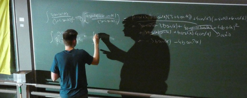 Vor einem Publikum, das sich in den Hörsaal drängen musste und einem gut besuchten YouTube Livestream startete das Integration Bee 2024 direkt zu Beginn mit dem Professoren-Duell. Dabei trat ein Professor gegen ein ganzes Team von Doktoranden einer anderen Arbeitsgruppe an und setzte sich durch routinierte Rechenkünste ohne Probleme gegen diese durch.