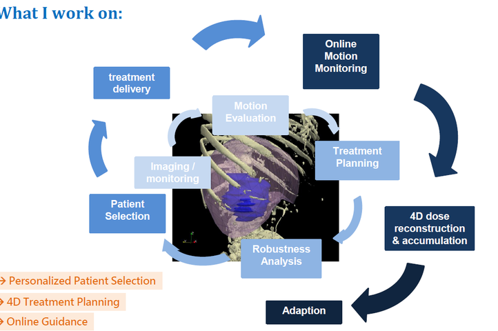 Wie man sieht, überlappen sich die einzelnen Bereiche immer wieder, sodass sich in jedem Fall ein sehr vielseitiger Beruf ergibt. Antje Knopf war bis vor kurzem als Associate Professor am University Medical Center Groningen beschäftigt und ist nun in der Neustrukturierung der nationalen Krebsforschung in Deutschland tätig. Im Bild unten seht ihr einen Überblick über die die Tätigkeit in der Protonentherapie.