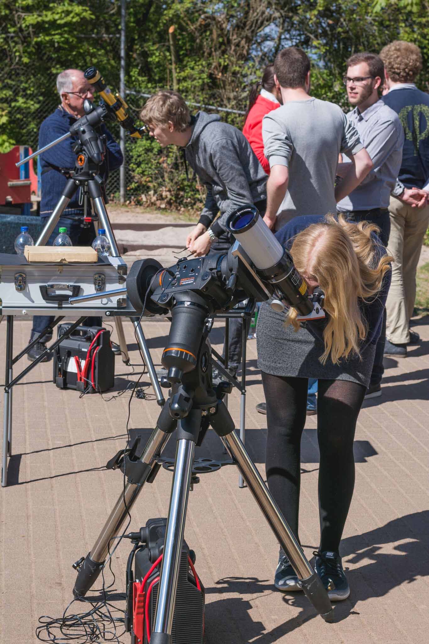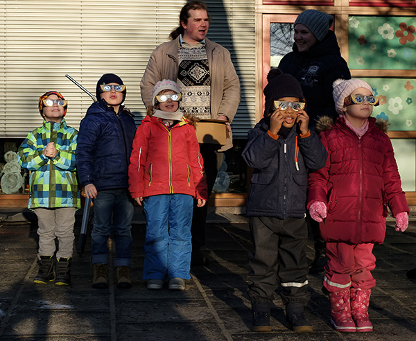 Inhalt:Auch am Tag besteht die Möglichkeit, astronomische Objekte am Himmel zu sehen. Diese Erfahrungen haben auch schon die kleinen Sterngucker der KiTa Pinocchio in Ramstein-Miesenbach gemacht. Mit großer Begeisterung haben sie - ausgerüstet mit den vom Regionalverband gesponserten Teleskopen und Ferngläsern - unter Anleitung von Herrn Dr. Anders und Herrn Dr. Becker ihre ersten Beobachtungen der Mondes machen dürfen. Dabei haben sie zunächst eifrig einem Vortrag gelauscht, der auch auf die Gefahren der Sonne aufmerksam machte. Aber der Einsatz der Schutzbrillen ermöglichte schließlich auch den sicheren Blick zur Sonne. Die kleinen Forscher werden noch lange an diesen Termin zurückdenken. |