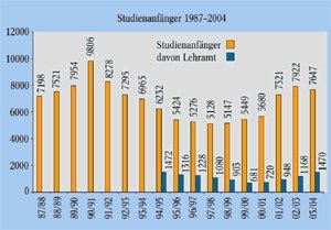 Abb. 1: Entwicklung der Studienanfänger in Diplom und Lehramt (Quelle: Physik Journal 3 (2004), 8/9; KFP/DPG)