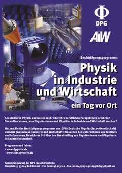 Bad Honnef, 13. Oktober 2005 – Einblick in den Berufsalltag von Physikerinnen und Physikern bietet auch in dieser Saison das Besichtigungsprogramm des „Ausschusses Industrie und Wirtschaft“ der Deutschen Physikalischen Gesellschaft. „Ein Tag vor Ort“ heißt die Aktion, an der bundesweit rund 40 Unternehmen und Forschungseinrichtungen teilnehmen. Ab Dezember 2005 bis zum nächsten Frühjahr öffnen sie zu speziellen Terminen die Pforten zu Laboren und Entwicklungsbüros. Das Besichtigungsprogramm richtet sich insbesondere an Studierende, steht jedoch allen Interessenten offen.