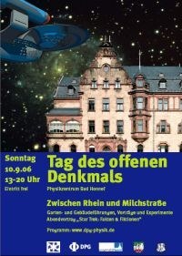 Am „Tag des offenen Denkmals“ ist das Physikzentrum komplett auf neugierige Besucher eingestellt. So gibt es Gelegenheit, nicht nur das Gebäude und die Computer-Installation „Schwarzes Loch“ in Augenschein zu nehmen. Ebenfalls angeboten werden Führungen durch den Garten und Vorträge. Elmar Scheuren, Direktor des Siebengebirgsmuseums Königswinter, spricht über „Bürgerliche Villen im Geiste der Rheinromantik“. Derweil führt der Bonner Astrophysiker Peter Schneider durch die Weiten des Universums – sein Motto: „Jenseits der Milchstraße: Gravitationslinsen – ein neues Werkzeug der Astronomie“. Ein echtes Bonbon nicht nur für Science-Fiction-Fans ist der Vortrag „Star Trek – Fakten & Fiktionen“. Der Dortmunder Physikprofessor Metin Tolan blickt dabei hinter die Kulissen der Kult-Serie „Raumschiff Enterprise“ und erläutert – anhand zahlreicher Video-Sequenzen – was es mit „Warp-Antrieb“ und „Beamen“ auf sich hat.