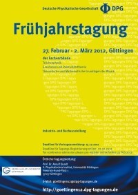 Bad Honnef/Göttingen, 21. Februar 2012 – An der Universität Göttingen findet vom 27. Februar bis zum 2. März 2012 die Frühjahrstagung der Deutschen Physikalischen Gesellschaft (DPG) statt. Damit wird Göttingen zum Treffpunkt der Teilchenphysik, Mathematischen Physik und Gravitationsforschung: Rund 1.400 Wissenschaftlerinnen und Wissenschaftler aus aller Welt diskutieren über die neuesten Ergebnisse auf der Suche nach dem Higgs-Boson, den Stand der „Dunklen Materie“, die Oszillationen und Geschwindigkeit von Neutrinos, kosmische Strahlung und die Experimente am Europäischen Zentrum für Kern- und Teilchenphysik (CERN) in Genf. Neben der experimentellen Grundlagenforschung geht es dabei auch um aktuelle Entwicklungen in der Theoretischen und Mathematischen Physik.