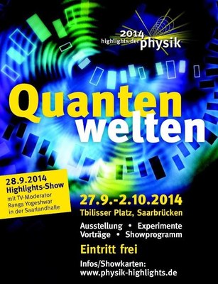 Saarbrücken, 27. September 2014 – Seit Beginn des Jahrhunderts gastiert das Wissenschaftsfestival „Highlights der Physik“ von Jahr zu Jahr in einer anderen Stadt. In Saarbrücken heißt das Thema „Quantenwelten“. Vom 27. September bis zum 2. Oktober wird der Tbilisser Platz zu einem mobilen Science Center. Forscher und Forscherinnen aus Saarbrücken und der gesamten Bundesrepublik sowie aus Frankreich und Luxemburg stehen dort Rede und Antwort. Sie erklären, wie ein Quantencomputer funktioniert und was es mit modernen Verschlüsselungsmethoden auf sich hat. Außerdem gibt es Live-Experimente und jede Menge Wissenschaft zum Anfassen und Ausprobieren. Zahlreiche Wissenschaftsshows auf Open-Air-Bühnen, Vorträge von Spitzenforschern, ein Schülerwettbewerb für Tüftler und Erfinder, ein „Juniorlabor“ für Kinder ab drei, ein Science Slam sowie die große Highlights-Show mit ARD-Moderator Ranga Yogeshwar in der Saarlandhalle bieten ein abwechslungsreiches Programm für die ganze Familie. Der Eintritt zu allen Veranstaltungen ist frei. Infos: www.physik-highlights.de.