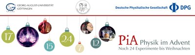 Unter dem Motto „noch 24 Experimente bis Weihnachten“ bieten die Deutsche Physikalische Gesellschaft (DPG) und die Universität Göttingen auch in diesem Jahr wieder 24 unterhaltsame Physik-Experimente zum Nachmachen an. Sie richten sich primär an Schülerinnen und Schüler der Jahrgangsstufen fünf bis zehn und sind vom 1. bis zum 24. Dezember per Youtube-Video oder unter www.physik-im-advent.de abrufbar.
