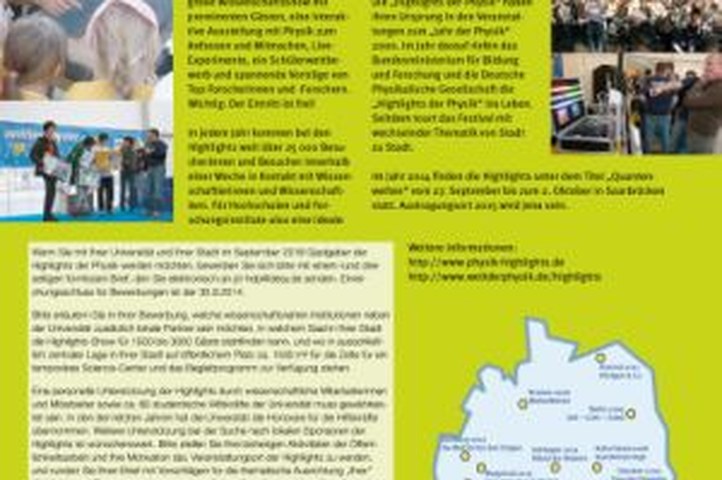 Wenn Sie mit Ihrer Universität und Ihrer Stadt im September 2016 Gastgeber der Highlights der Physik werden möchten, bewerben Sie sich bitte mit einem rund dreiseitigen formlosen Brief, den Sie elektronisch an www.dpg-physik.de senden. Einreichungsschluss für Bewerbungen ist der 30.9.2014.