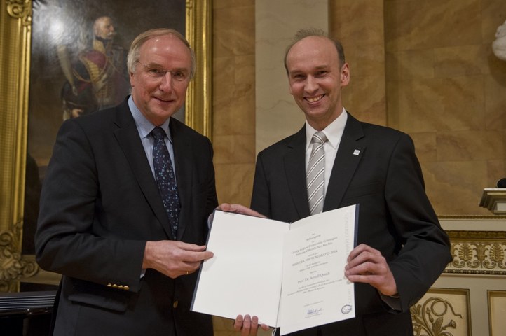 Arnulf Quadt von der Fakultät für Physik der Georg-August-Universität Göttingen und seit kurzem Vorstandsmitglied der Deutschen Physikalischen Gesellschaft (DPG) für Öffentlichkeitsarbeit erhielt den Preis des Stiftungsrates 2014 der Universität Göttingen in der Kategorie „Wissenschaft und Öffentlichkeit“. Ausgezeichnet wurde er für das von ihm initiierte Projekt „PiA – Physik im Advent“ . Quadt hat es mit dem Projekt geschafft, auf Anhieb eine große Resonanz hervorzurufen, junge Menschen für Naturwissenschaft und Technik zu begeistern und die Faszination für das genaue Beobachten von Naturphänomenen zu wecken. Wir gratulieren! (Bild: Georg-August-Universität Göttingen)