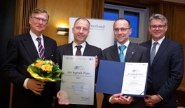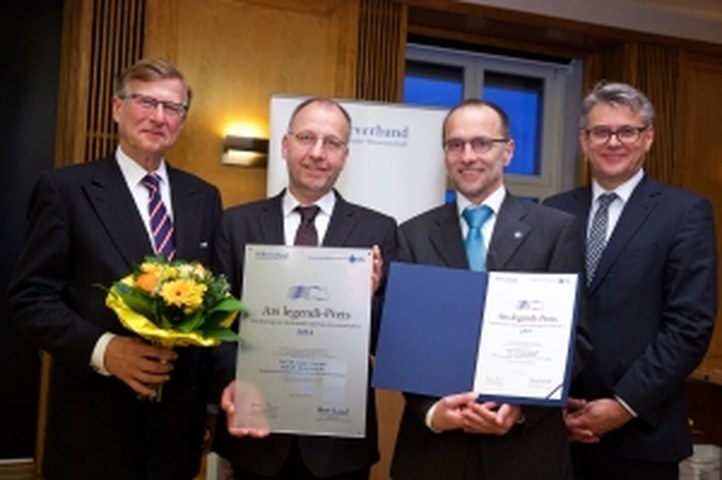 Die DPG gratuliert Jürgen Sum und Bernd Jödicke von der Hochschule Konstanz Technik, Wirtschaft und Gestaltung zum Ars-legendi-Fakultätenpreis Mathematik und Naturwissenschaften für exzellente Hochschullehre. (v.l.n.r.. Edward G. Krubasik, Präsident der DPG; Jürgen Sum und Bernd Jödicke von der Hochschule Konstanz Technik, Wirtschaft und Gestaltung sowie Volker Meyer-Guckel, stellvertretender Generalsekretär des Stifterverbandes)