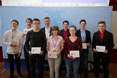 Bild: Die Gewinner des GYPT 2018. Vorn das Siegerteam PhysIQs mit Erik Sünderhauf, Sächsisches Landesgymnasium Sankt Afra, Meißen, Saskia Drechsel, Glückauf-Gymnasium, Dippoldiswalde und Lisa Marleen Allisat, Anton-Philipp-Reclam-Gymnasium, Leipzig. (v.l.n.r.).