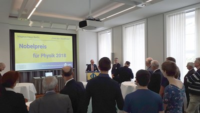 Berlin/Bad Honnef, 2. Oktober 2018 – „Besonders freut mich, dass mit Donna Strickland nach langer Zeit eine Frau unter den Preisträgern ist und damit ein starkes Zeichen für die Zukunft setzt“, sagt DPG-Präsident Dieter Meschede. „Sie ist genau wie ihre Kollegen eine überaus würdige Preisträgerin.“ Zusammen mit vielen Journalistinnen und Journalisten verfolgte er im Magnus-Haus Berlin, der Hauptstadtrepräsentanz der Deutschen Physikalischen Gesellschaft (DPG), die Live-Übertragung zur Bekanntgabe des Nobelpreises für Physik. Wie es der Zufall will, forscht Dieter Meschede selbst stark mit Lasern, um Quanteneffekte zu untersuchen.
