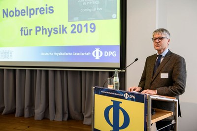 Berlin/Bad Honnef, 8. Oktober 2019 – „Es ist wieder ein tolles Beispiel dafür, wie verbesserte Messmethoden ein neues Fenster zum Universum aufstoßen“, sagt Dieter Meschede, Präsident der Deutschen Physikalischen Gesellschaft (DPG) zur Verleihung des diesjährigen Nobelpreises für Physik an James Peebles, Michel Mayor und Didier Queloz. „Zudem zeigen deren Arbeiten, wie moderne Beobachtungsmethoden ganz neue Modelle vom Kosmos hervorbringen." Zusammen mit vielen Journalistinnen und Journalisten verfolgte er im Magnus-Haus Berlin, der Hauptstadtrepräsentanz der Deutschen Physikalischen Gesellschaft, die Live-Übertragung zur Bekanntgabe des Nobelpreises für Physik.