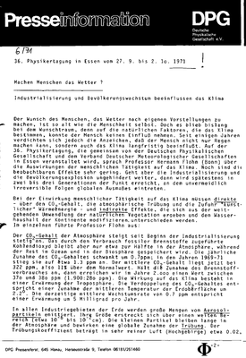 Presseinformation des Arbeitskreises Energie der Deutschen Physikalischen Gesellschaft anlässlich der 36. Physikertagung in Essen vom 27. 9. bis 2.10. 1971 - Warnung der DPG vor einer drohenden Klimakatastrophe von Dezember 1985