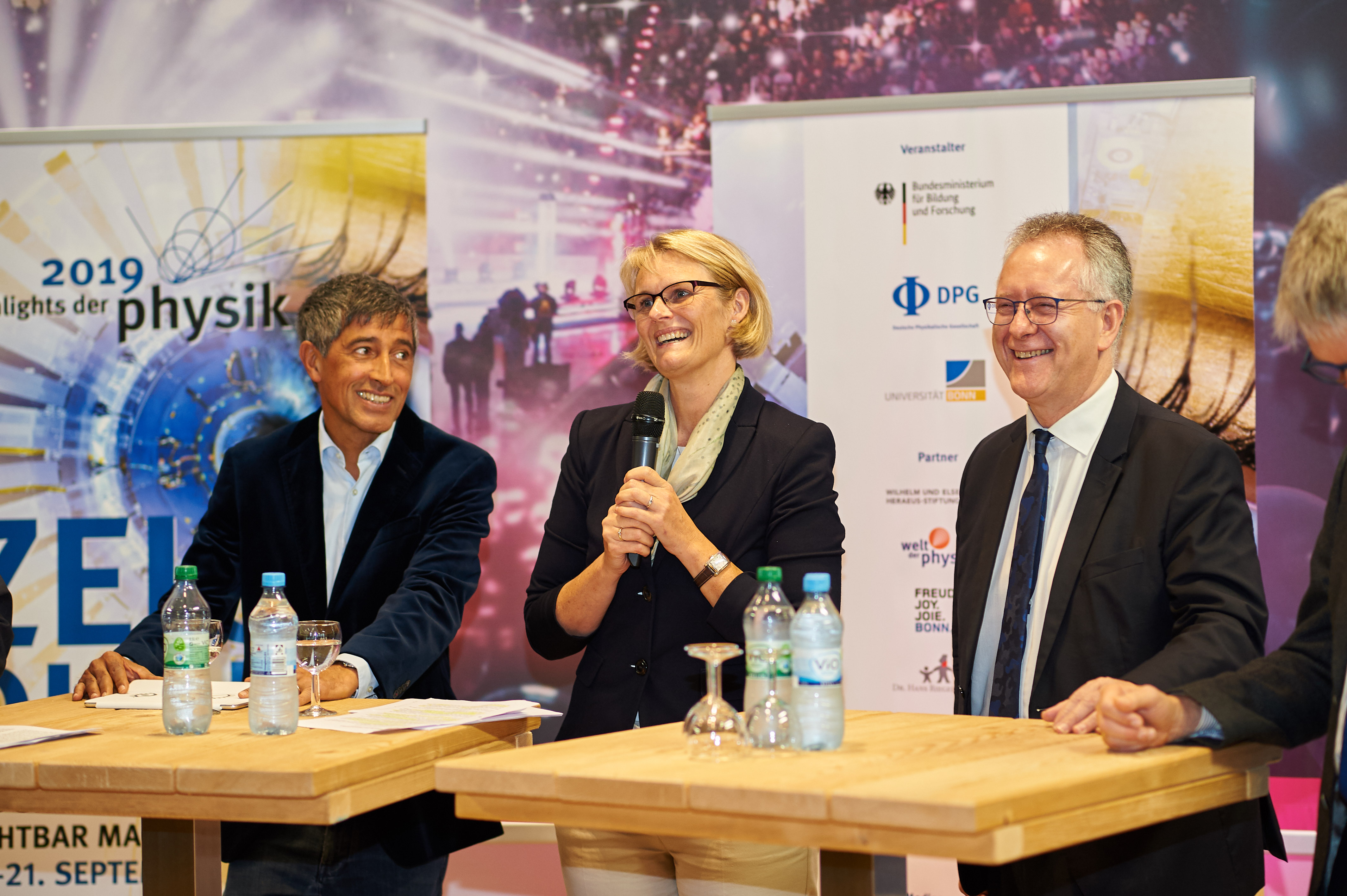 Bonn, 16. September 2019. Unter dem Motto „Zeig Dich! Das Unsichtbare sichtbar machen“ wird Bonn vom 16. bis zum 21. September zur Bühne für das Wissenschaftsfestival „Highlights der Physik“. Mit einer großen Wissenschaftsshow im Bonner Telekom Dome eröffnet Bundesforschungsministerin Anja Karliczek heute zusammen mit dem Präsidenten der Deutschen Physikalischen Gesellschaft Prof. Dr. Dieter Meschede und dem Rektor der Universität Bonn Prof. Dr. Dr. h. c. Michael Hoch das einwöchige Physikspektakel, zu dem rund 50.000 Besucherinnen und Besucher erwartet werden. Veranstalter der „Highlights der Physik“ sind das Bundesministerium für Bildung und Forschung (BMBF), die Deutsche Physikalische Gesellschaft (DPG) und die Universität Bonn.