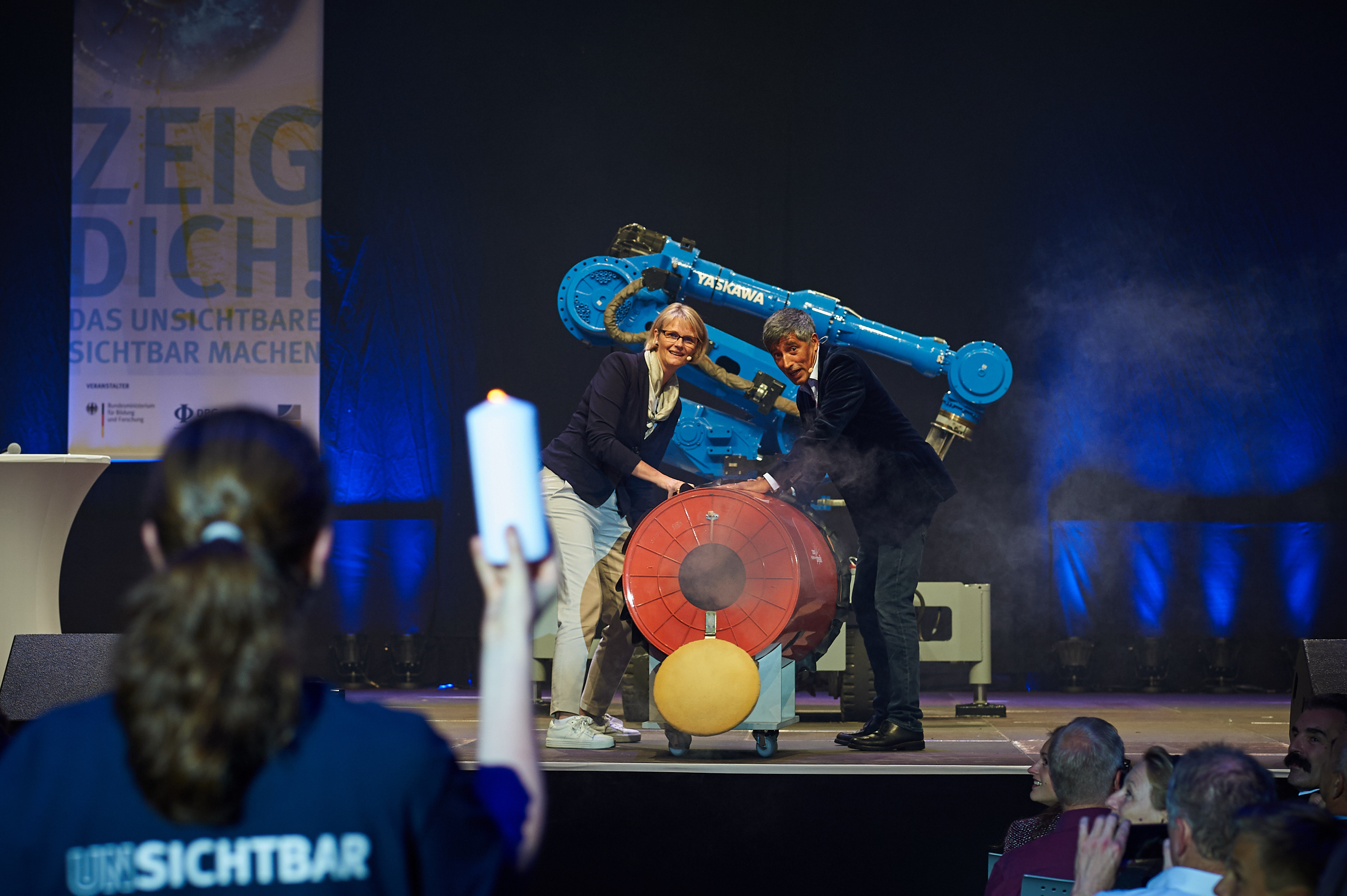 Den Auftakt des Wissenschaftsfests bildet die „Highlights-Show“ am Abend des 16. September mit rund 4.500 Besucherinnen und Besuchern. Durch das Programm mit prominenten Gästen führt ARD-Wissenschaftsmoderator Ranga Yogeshwar. „Mit einer Kombination aus Wissenschaft und Unterhaltung, mit Live-Experimenten, Roboter-Akrobatik, Artistik, Comedy und Live-Musik ziehen wir die Besucherinnen und Besuchern hinein in die Faszination von Physik und Information. Wir sprechen mit einer KI-Forscherin, die an mobilen Rettungsrobotern forscht, und zeigen, wie die Physikerinnen und Physiker mit immer neuen und besseren Mikroskopen und Teleskopen das Innerste der Welt und die Weiten des Alls erforschen“, sagt Prof. Dr. Dieter Meschede, Präsident der DPG.