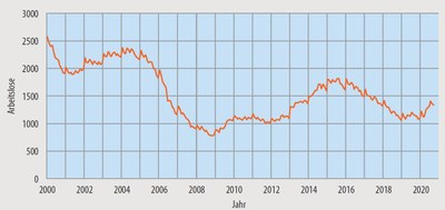 Demnach ist die Zahl der Arbeitslosen in der Physik erstmals seit 2015 im Vergleich zum Vorjahr (Berichtszeitraum jeweils Oktober bis September) gestiegen. Die höheren Arbeitslosenzahlen sind offensichtlich der Coronakrise geschuldet. So war ab April 2020 ein sprunghafter Anstieg zu beobachten, nachdem der März-Wert noch dem normalen, jahreszeitlichen Verlauf entsprach. Die Veränderung der Arbeitslosenzahlen für den „Erwerbsberuf Physiker“ relativ zum März bildet direkt den Verlauf des Gesamtarbeitsmarktes ab, der im Zuge der Coronakrise eingebrochen ist.