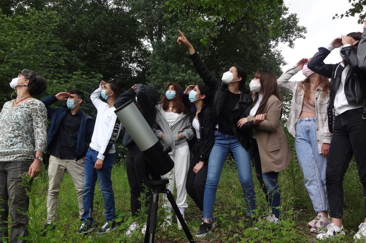 Dass man mittags nur einen einzigen Stern beobachten kann, nämlich die Sonne, weiß der Projektkurs Astronomie der Q1 durchaus: Auf dem Foto freuen sich die Schülerinnen und Schüler sowie ihre Lehrerin Bettina Hampel über all das, was sie bei den kommenden nächtlichen Beobachtungsterminen mit dem Teleskop zu sehen bekommen: Galaxien, Nebel und Sternhaufen.