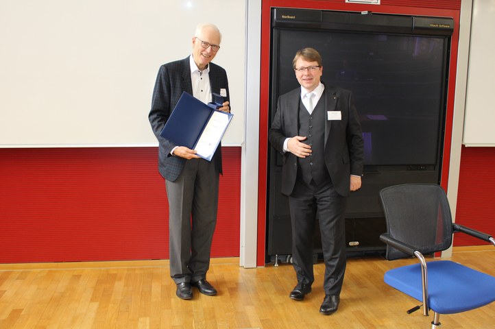 Anlässlich der AKE-Herbstsitzung und des Ehrenkolloquiums für Hardo Bruhns zeichnete DPG-Präsident Lutz Schröter den langjährigen Vorsitzenden des Arbeitskreises Energie mit der Ehrennadel der Deutschen Physikalische Gesellschaft aus.