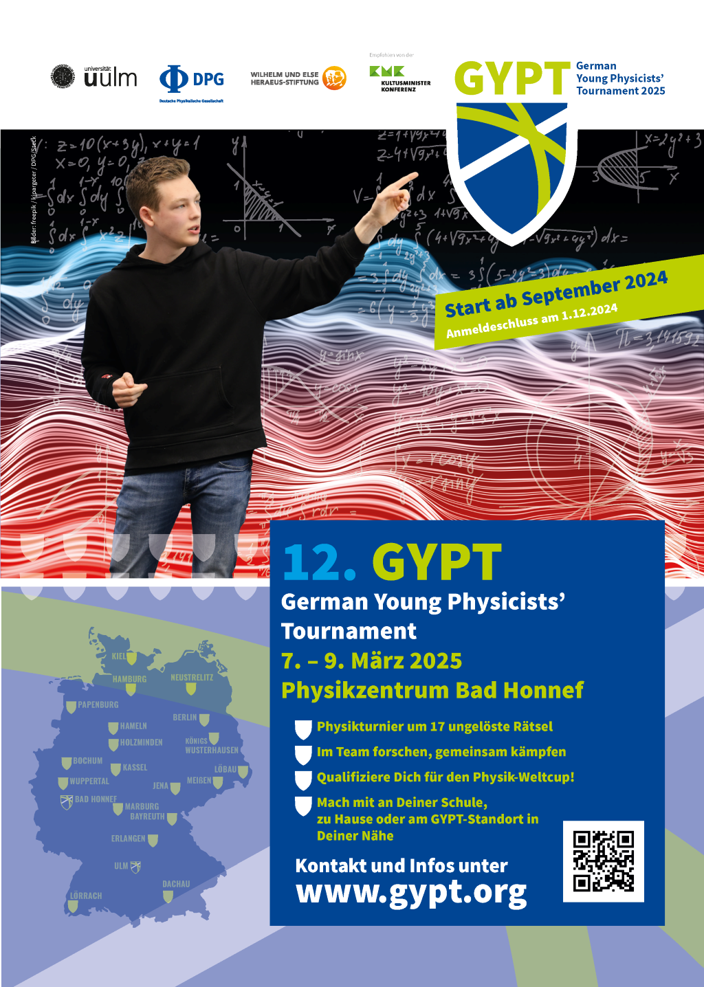 Bad Honnef, 01. Oktober 2024 – "Experimentieren, Präsentieren, Diskutieren" lautet das Motto des German Young Physicists' Tournament (GYPT), das seit mehr als zehn Jahren die Physikbegeisterung von Schülerinnen und Schülern fördert. Im Rahmen des bundesweiten Physikwettbewerbs erforschen Jugendliche in Teams eine von 17 herausfordernden Aufgaben aus der Physik. Der Wettbewerb verläuft mehrstufig und begleitet das Schuljahr. Im Januar 2025 treten die Teams bei den Regionalwettbewerben an den verschiedenen GYPT-Zentren oder online gegeneinander an. Das große Finale, der 12. GYPT-Bundeswettbewerb, findet vom 7. bis 9. März 2025 im Physikzentrum Bad Honnef statt.