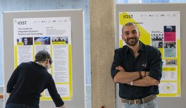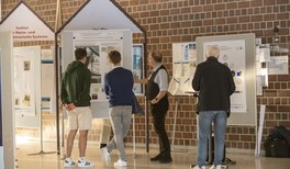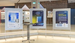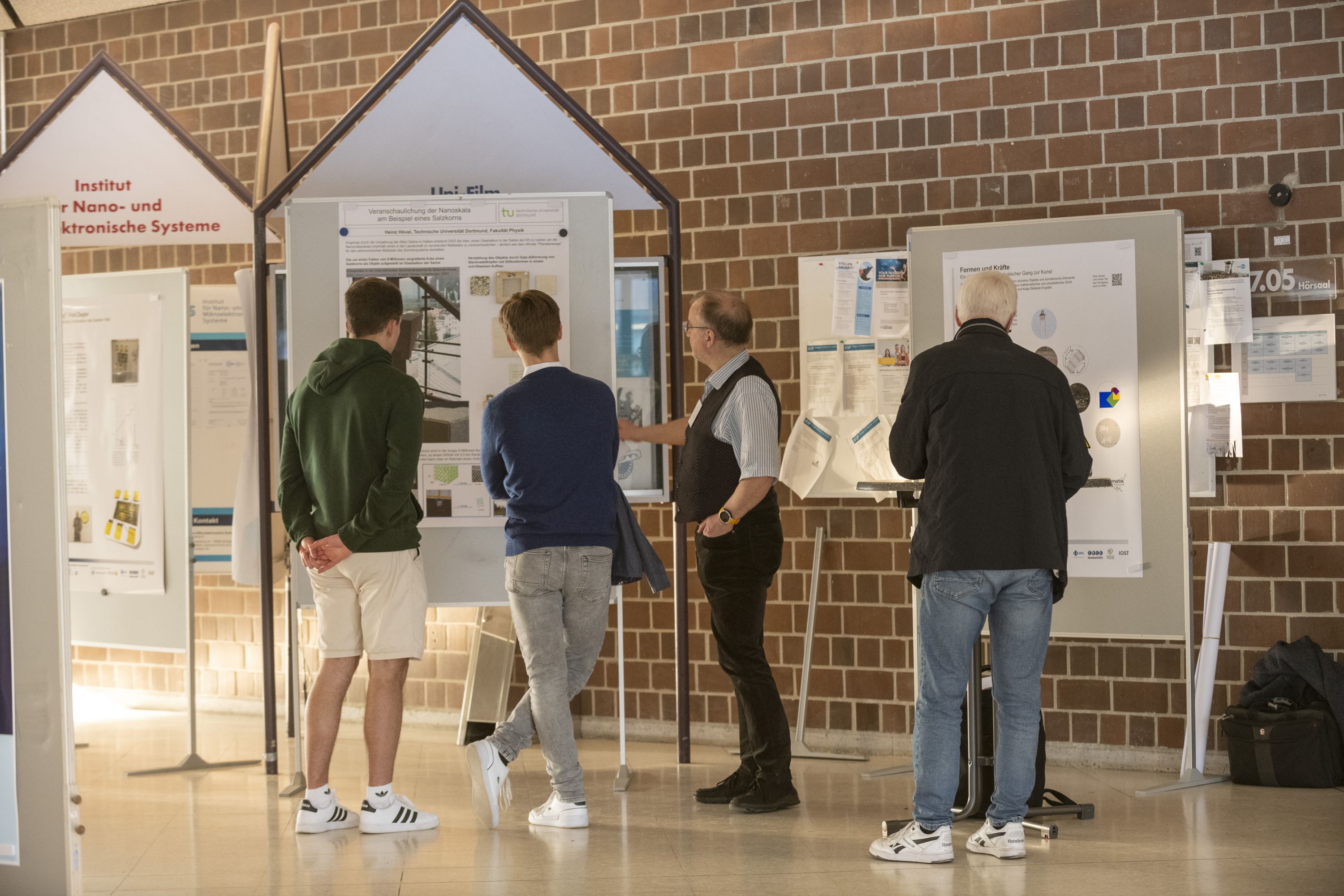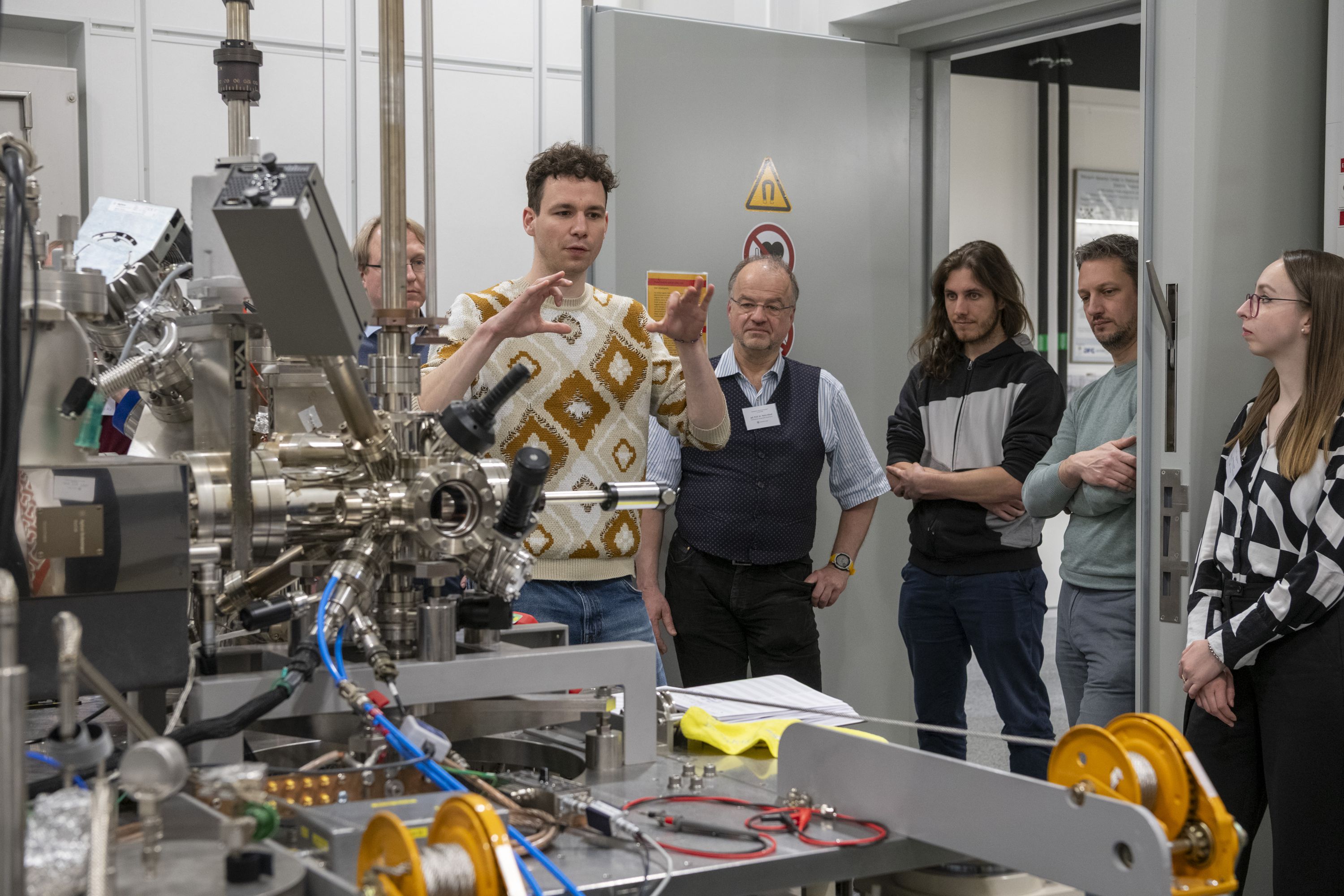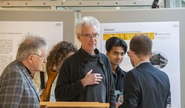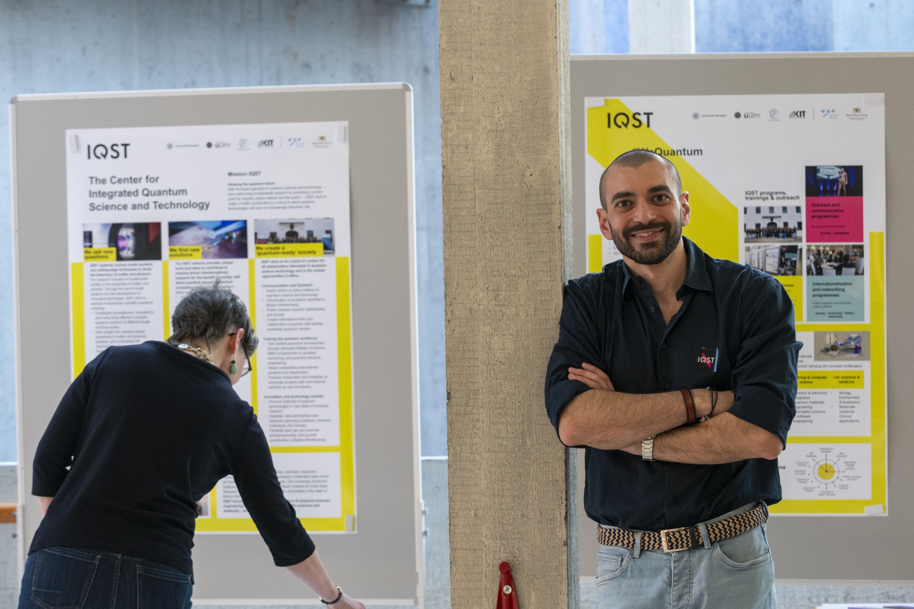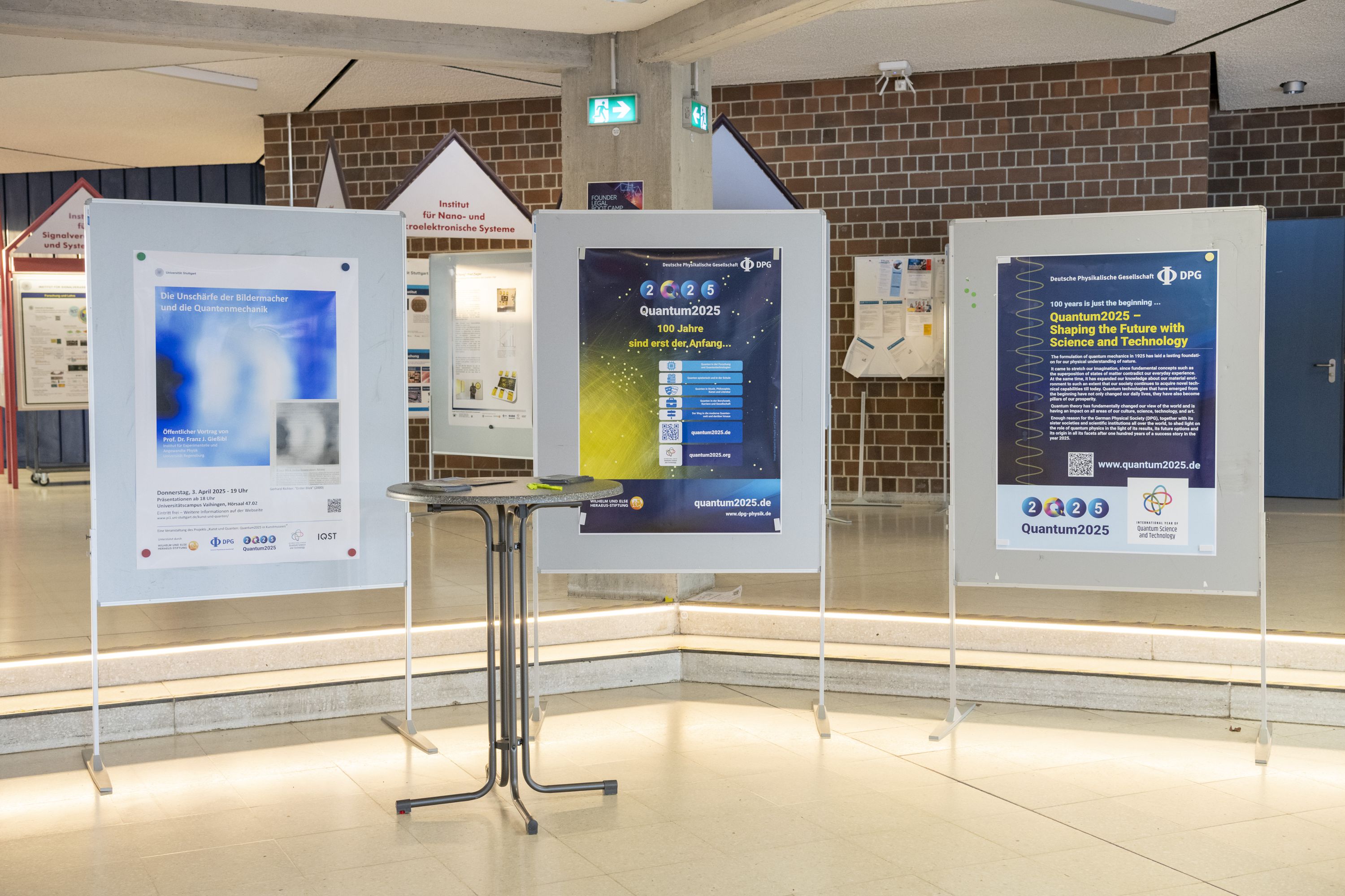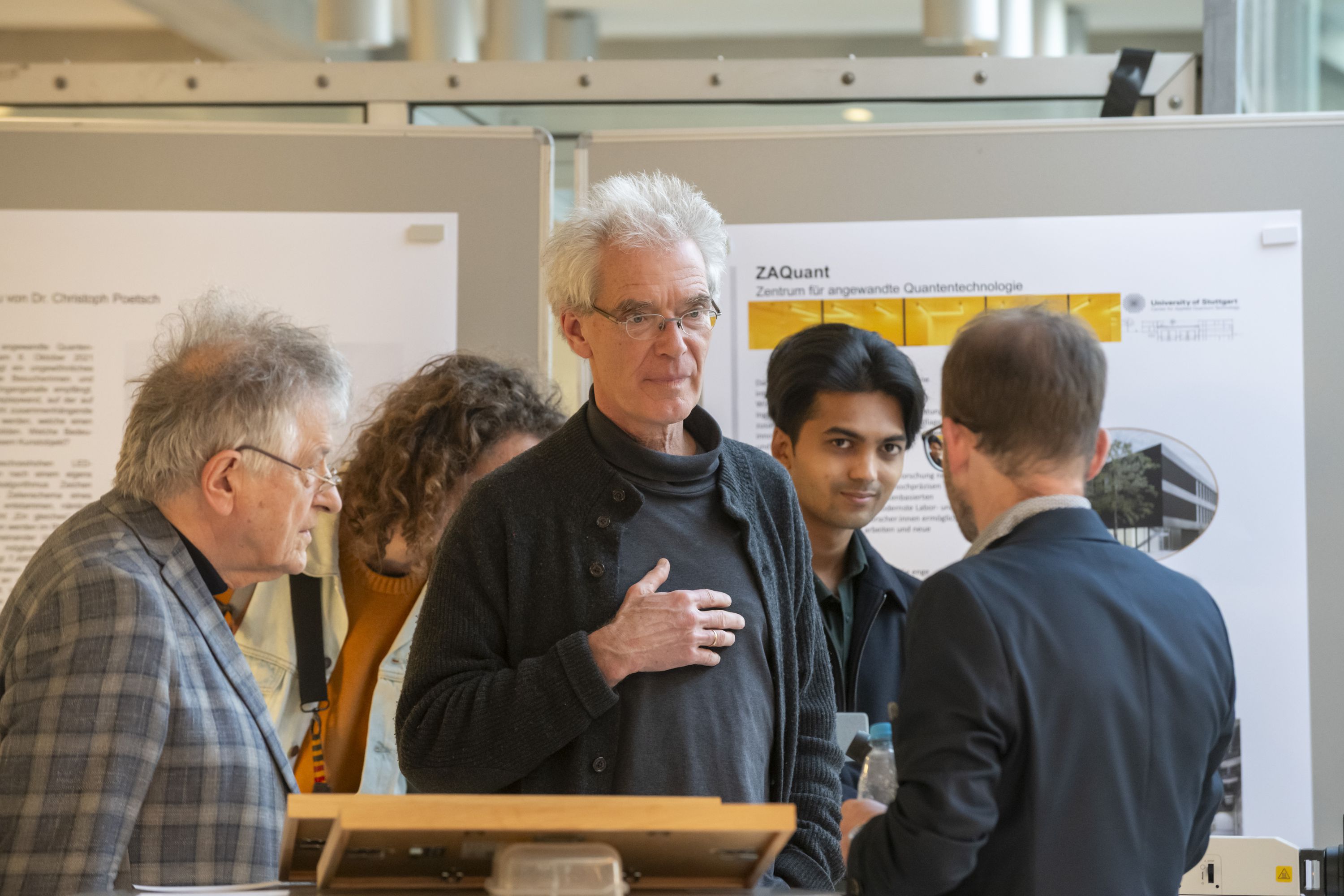 Am folgenden Tag, dem 3. April, folgte ein weiterer öffentlicher „Kunst und Quanten“-Abendvortrag, diesmal an der Universität Stuttgart. Franz J. Gießibl von der Universität Regensburg präsentierte „Die Unschärfe der Bildermacher und die Quantenmechanik“. Dabei ging es auch um einen besonderen interdisziplinären Austausch: Im Jahr 2000 wurde der Maler Gerhard Richter, einer der bedeutendsten bildenden Künstler unserer Zeit, auf eine wissenschaftliche Veröffentlichung von Franz Gießibl aufmerksam, die erstmals subatomare Strukturen mittels Rasterkraftmikroskopie zeigte. Hierdurch inspiriert schuf Gerhard Richter das Kunstwerk „Erster Blick“ und es begann ein jahrzehntelanger Austausch zwischen Künstler und Physiker. Vor dem Hörsaal konnten die Vortragsgäste außerdem an zahlreichen Postern weitere „Kunst und Quanten“-Themen kennenlernen und unter einem Mikroskop den „kleinsten Kandinsky der Welt“ bestaunen, der 2023 von Nanooptik-Forschenden der Universität Stuttgart in einen Silizium-Wafer strukturiert wurde.
