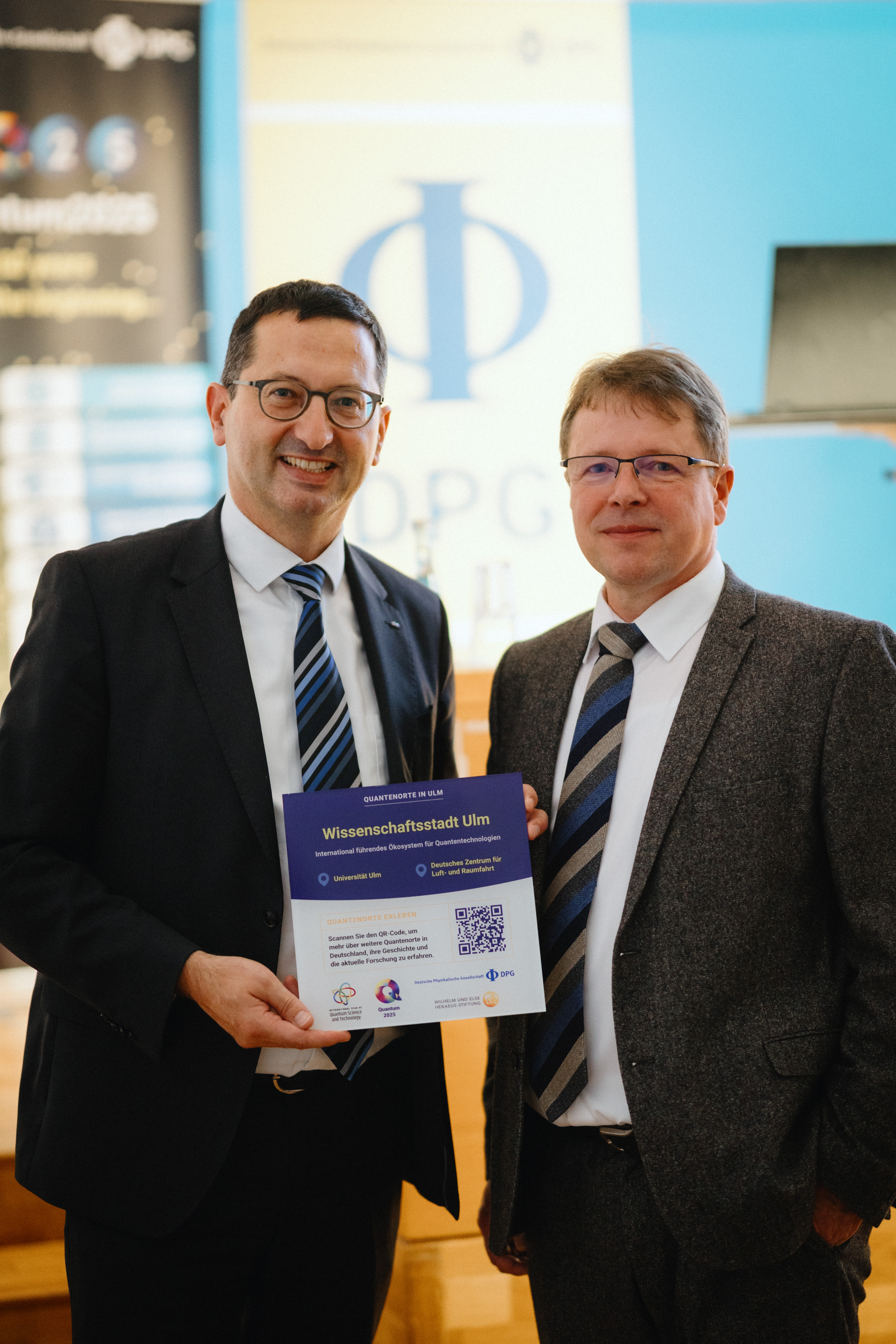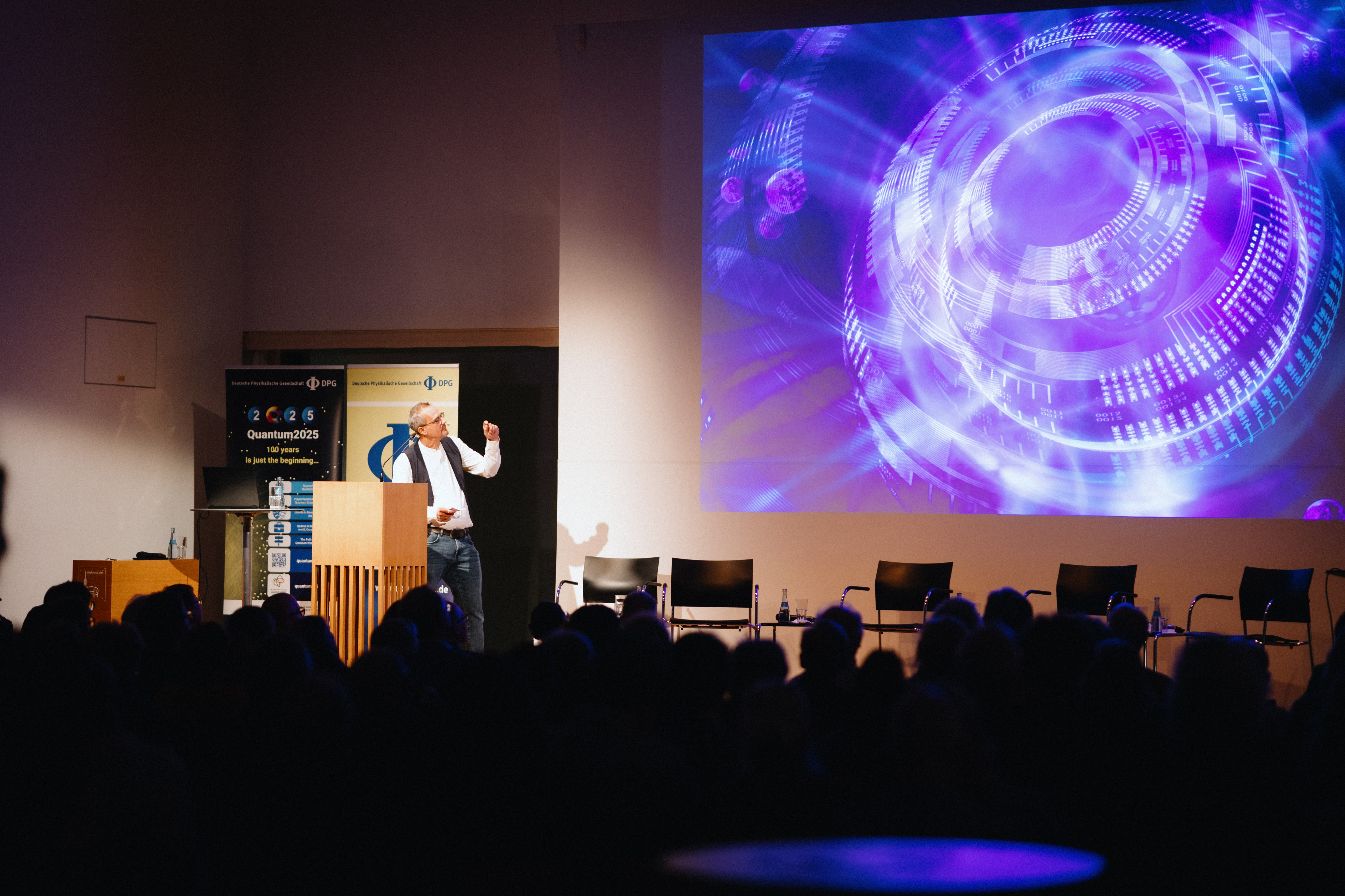 Hierzu gab es spannende Vorträge und eine Podiumsdiskussion mit Künstler:innen und Wissenschaftler:innen, begleitet durch die Moderation von Daniel Finger. Die Veranstaltung schlug die Brücke zwischen den internationalen Aktivitäten im Rahmen des Quantenjahres 2025, den nationalen Aktivitäten der DPG in Deutschland und den regionalen Aktivitäten in Ulm. Bereits im Frühjahr wurden der DLR Standort Ulm und die Universität Ulm als erster Quantenort in Deutschland ausgezeichnet. Mit einer weiteren Plakette, die im Rathaus Ulm angebracht wird und auf diese Institutionen verweist, wird die Wissenschaft auch in der Stadt Ulm präsent.