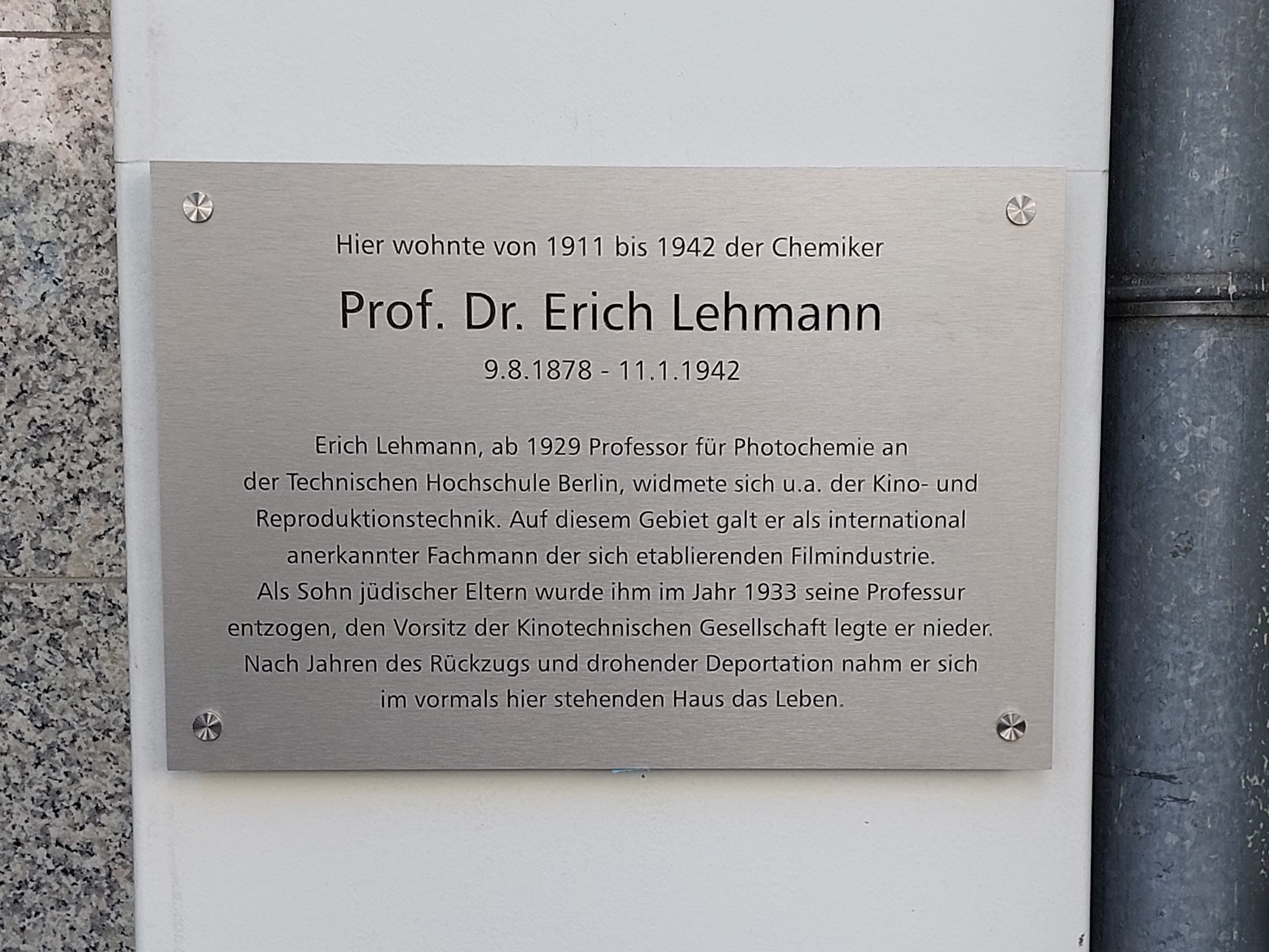 Am 12. Juni 2025 wurde in Berlin-Charlottenburg eine Gedenkplakette für den Chemiker und Physiker Prof. Dr. Erich Lehmann (1878–1942) eingeweiht, der aufgrund seiner jüdischen Herkunft zu den Opfern des NS-Staates gehört.