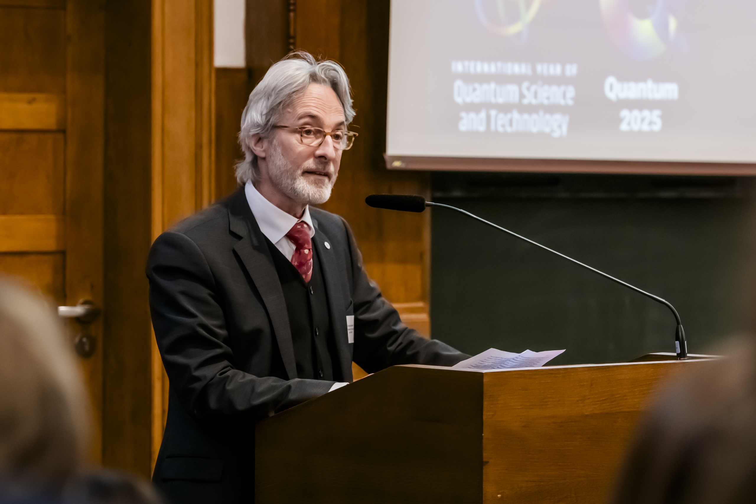 Christoph Schneider, Vizepräsident für Forschung der Humboldt-Universität zu Berlin, stellte das Netzwerk der bestehenden Quantenforschung in Berlin vor. „In einem hochkomplexen Feld wie der Quantenforschung sind Zusammenarbeit und der Austausch von Ideen der Schlüssel zum Erfolg. Die Quantenmechanik hat uns gelehrt, dass die Welt komplexer und vielschichtiger ist, als wir es uns oft vorstellen und es immer noch viel zu entdecken und zu verstehen gibt. Das Quantenjahr 2025 ist eine Gelegenheit, die Errungenschaften der Vergangenheit zu feiern und den Blick auf die Zukunft zu richten – und es ist eine Einladung an alle, sich mit den faszinierenden Konzepten der Quantenmechanik auseinanderzusetzen.“