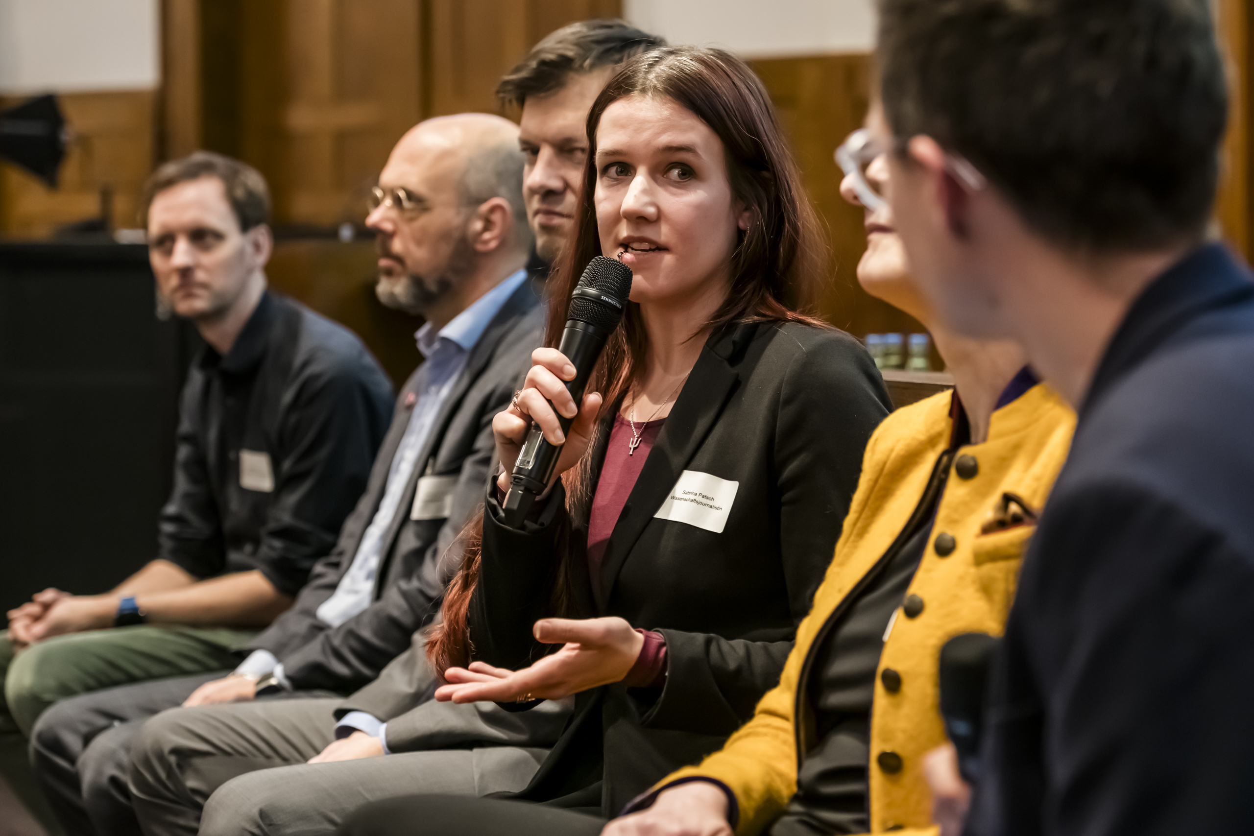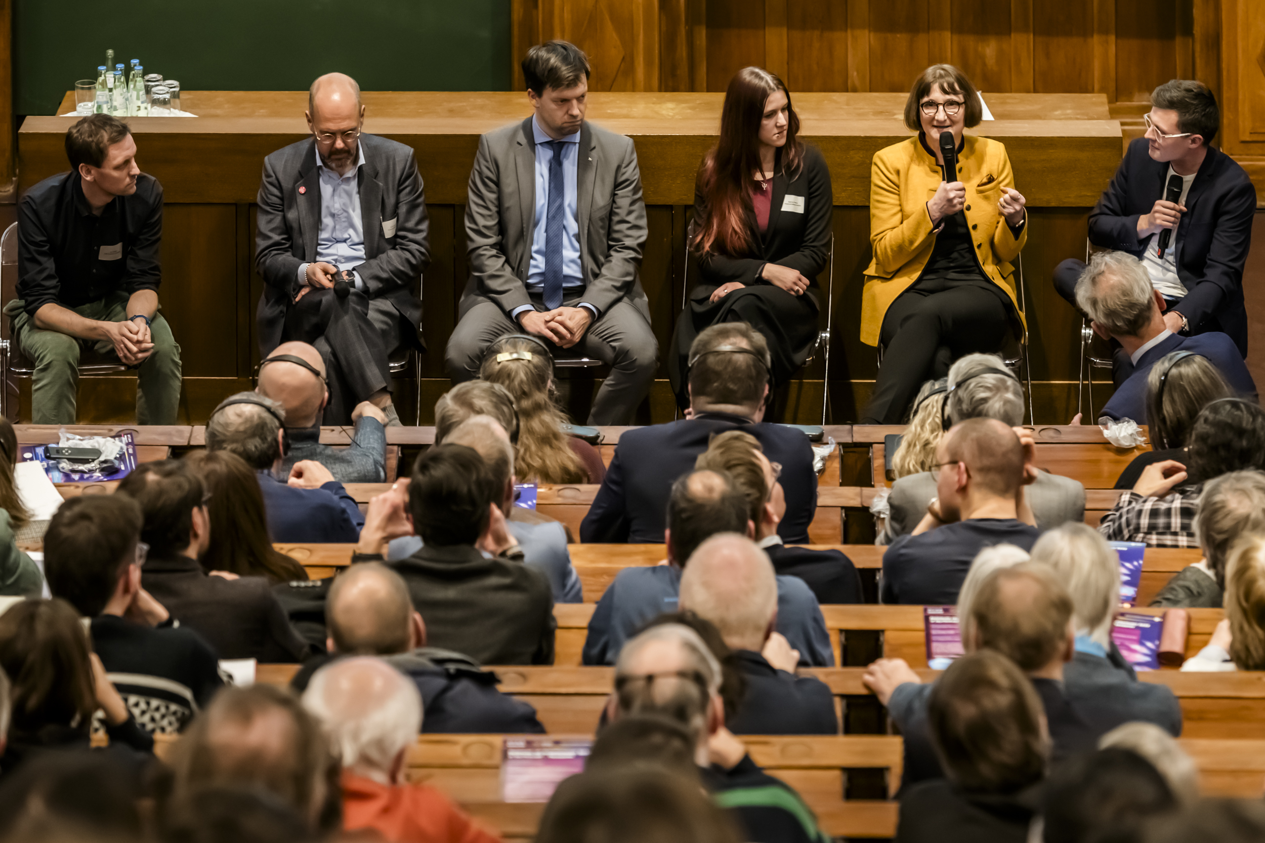 Daran knüpfte die anschließende Podiumsdiskussion an. Es wurde erörtert, dass die Quantenphysik sich auf kleinster Skala abspielt: Im Alltag sehe man keine einzelnen Atome, weshalb die Gesetze der Quantenmechanik häufig außerhalb unserer Vorstellungskraft liegen. Doch genau darin liege die Faszination. Außerdem wurden Perspektiven für die Entwicklung und einem zukünftigen Einsatz von Quantencomputern diskutiert.